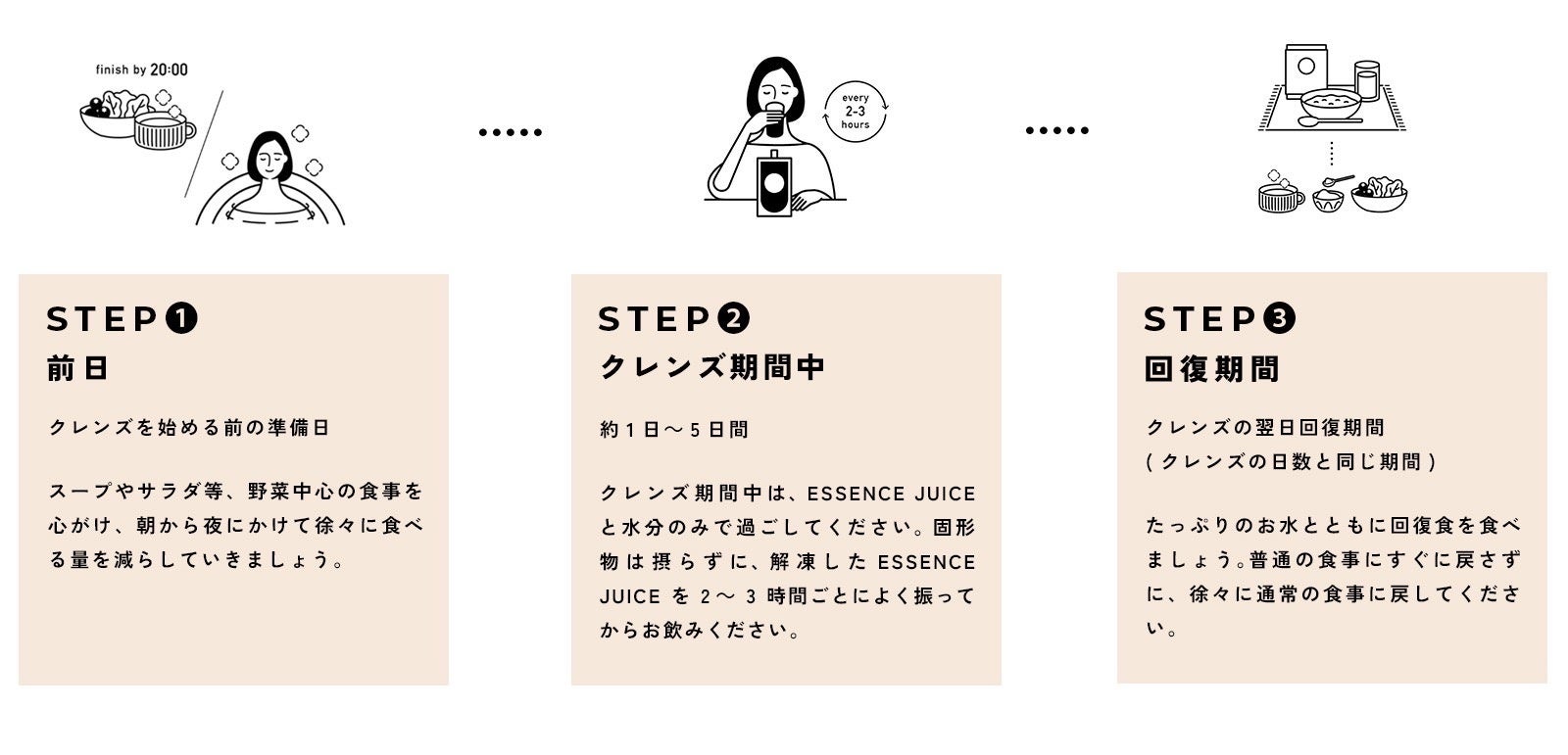 クレンズとは消化器官を休ませることで、消化に使うエネルギーや酵素が利用され、身体の毒素の排出を促していきます。消化器官をお休みさせてから毒素を排出するまで約36時間を必要としていますので、最低1日以上のクレンズをおすすめします。ESSENCEのクレンズは身体への負担を小さくするため連日5日以上の使用はおすすめできません。