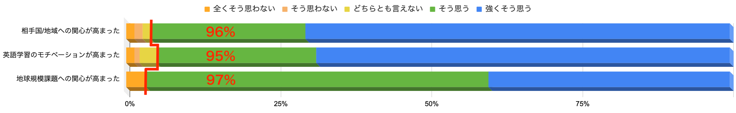 ⚫︎96% の生徒が「相手国/地域への関心が高まった」と回答