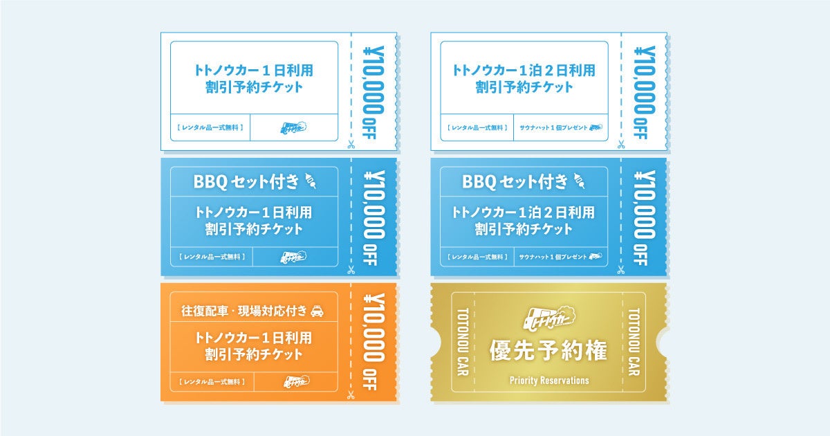 泊りがけでキャンプに行く場合におすすめの、トトノウカー1泊2日利用チケットです。サウナハット1個プレゼント付き。
