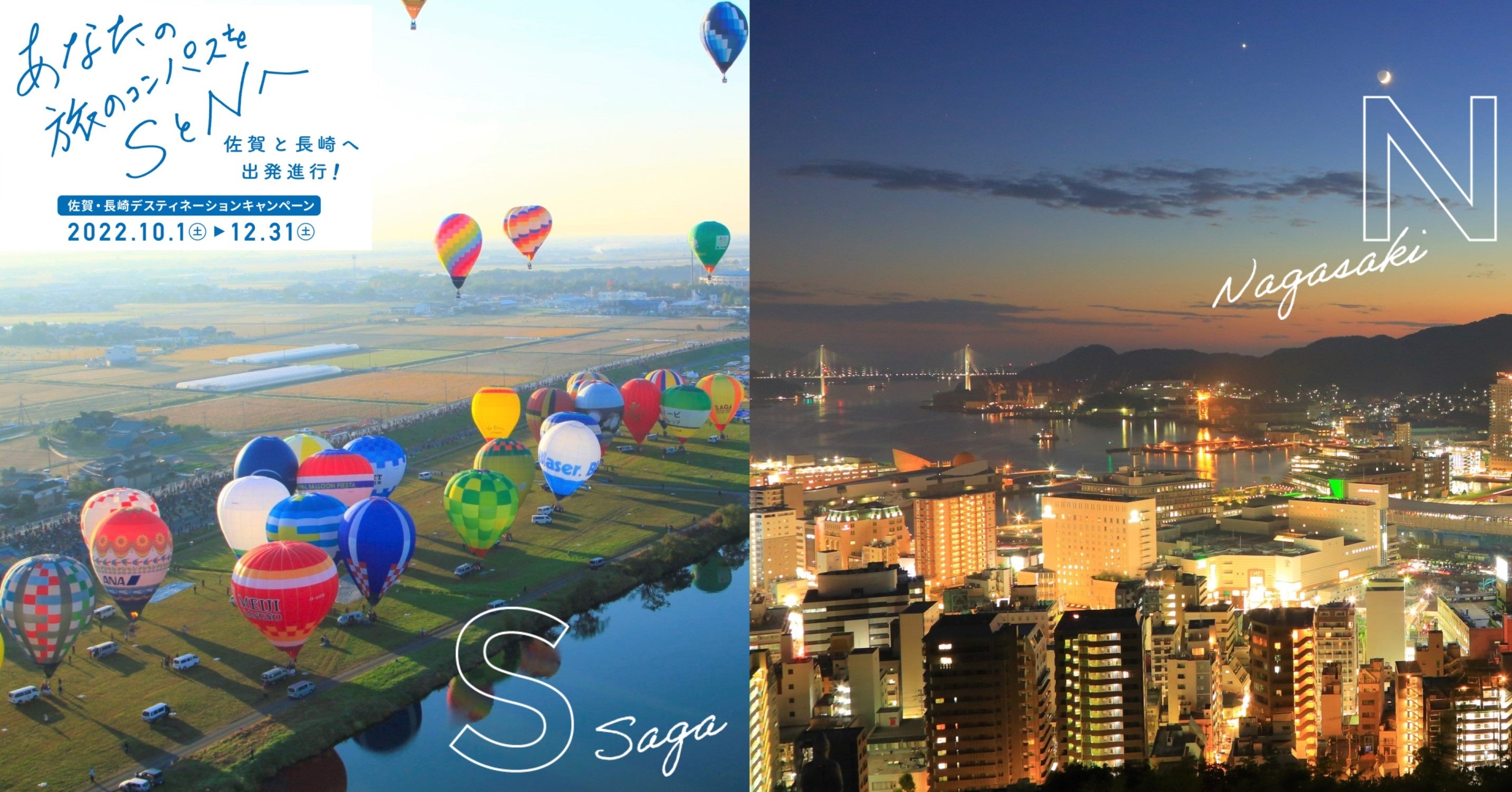 JRグループと佐賀・長崎両県が開催する大型観光キャンペーン。西九州新幹線の2022年9月23日開業に合わせて、両県が有する特色ある歴史や文化、豊かな自然、多様な食などの様々な魅力で、全国からお越しの皆様をお迎えいたします。両県の観光地情報や周遊プラン、モデルコースなども随時更新していますので、是非公式サイトをご覧ください。https://www.saga-nagasaki-dc.jp/