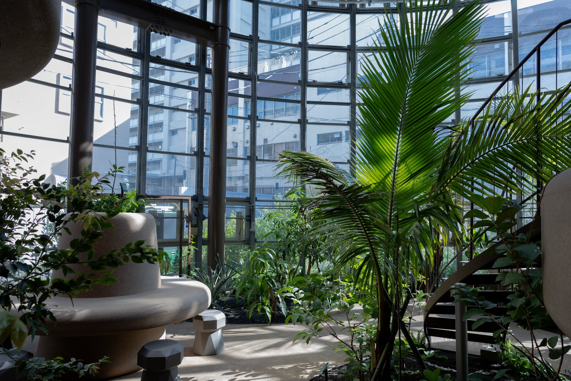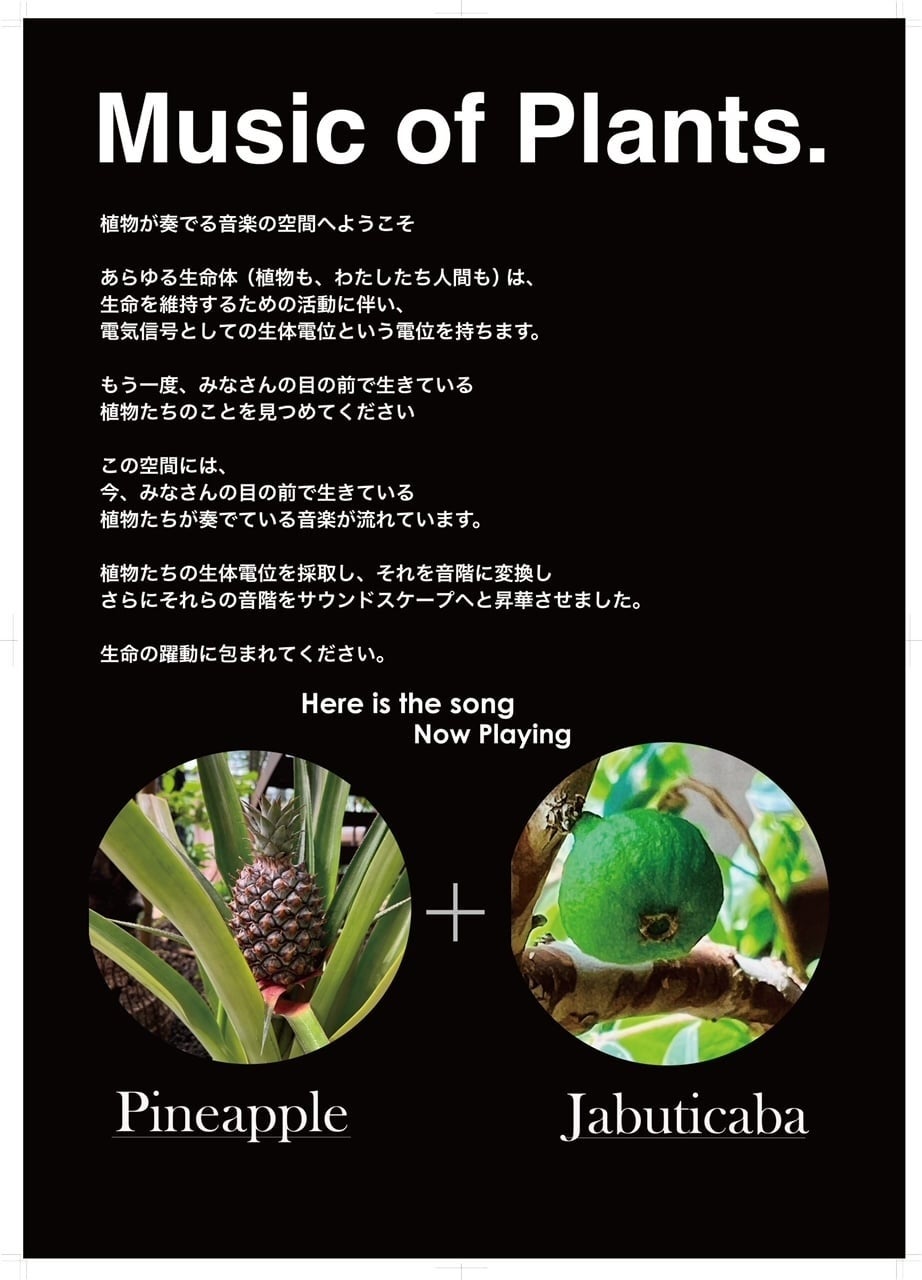 園内1階にある「Music of Plants.」のコーナーは、植物たちの生体電位を採取し、それを音階に変換し、さらにそれらの音階をサウンドスケープへと昇華させた、植物が奏でる音楽を聴けるスペースです。季節の植物によって変わるこの音を、このたび、1周年を記念して、夏バージョンとして園内で育てているパイナップルとジャボチカバの音階をミックスしたサウンドスケープを館内全体に流します。