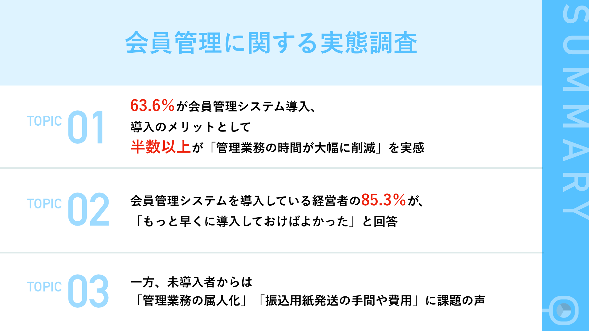 - 85.3%が、「会員管理システムをもっと早くに導入しておけばよかった」と回答
