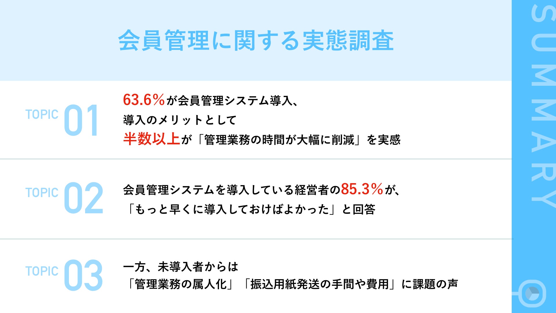 6割以上の経営者が、会員運営事業を運営する上で、会員管理システムを導入しており、導入したことで実感しているメリットとして、半数以上が、「管理業務の時間が大幅に削減」を実感していることがわかりました。また、ほとんどの導入者から、「もっと早く導入しておけばよかった」と声があがりました。対して、未導入者からは、「管理業務が属人化」や「振込用紙の発送の手間と時間がかかる」などの課題から、今後は会員管理システムを導入を検討している声もあがりました。