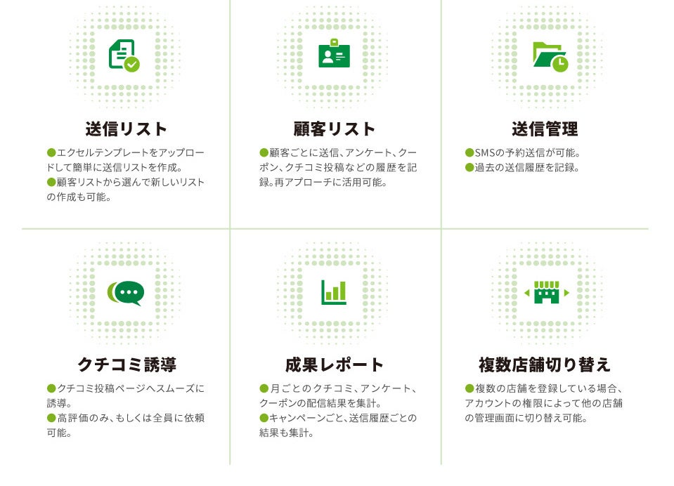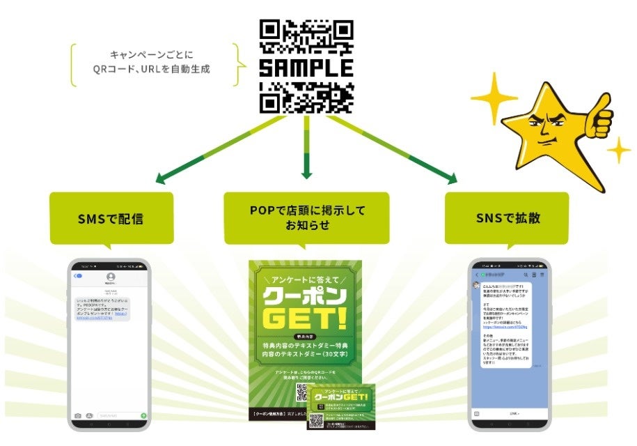簡単に作成できるキャンペーン機能を使い、ご来店したお客様にSMSや店頭ポップでアンケートやクーポンをお知らせ。あわせてご利用満足度の高いお客様へGoogleクチコミ投稿依頼することでGoogleマップの高評価クチコミの獲得、評価向上による新規顧客獲得、クーポン配布によるリピーター獲得を可能にします。