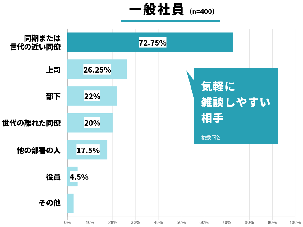 次に、雑談しやすい相手について、「一般社員」と「部長職以上」それぞれに質問しました。選択肢は「役員」「上司」「部下」「同期または世代の近い同僚」「世代の離れた同僚」「他の部署の人」「その他」の中から複数回答(3つまで)。結果は、「同期または世代の近い同僚」については一般社員・部長職以上ともに7割以上が雑談しやすいと回答。部長職以上では52%が「部下」が雑談しやすいと回答しました。