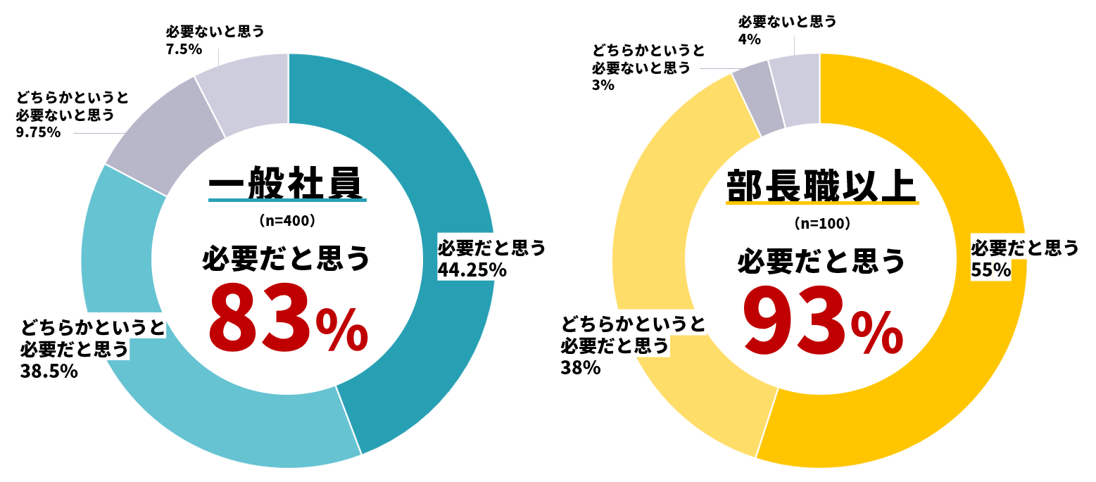 | 多くの回答者がオフィスでの『雑談』の必要性を認めていることがわかりました。部長職以上は一般社員と比較して「必要だと思う」が10ポイント以上高く、人材管理やマネジメントを行う役職柄、周囲とのコミュニケーションの重要性を高く捉えていると予想できます。 |