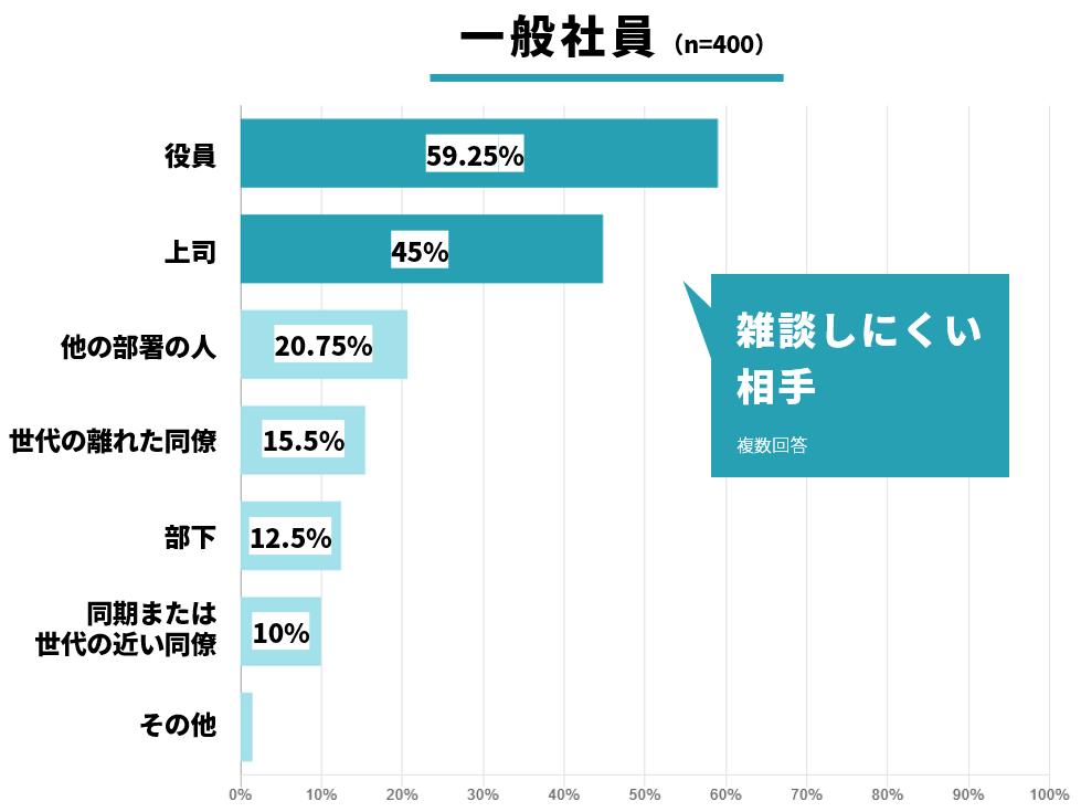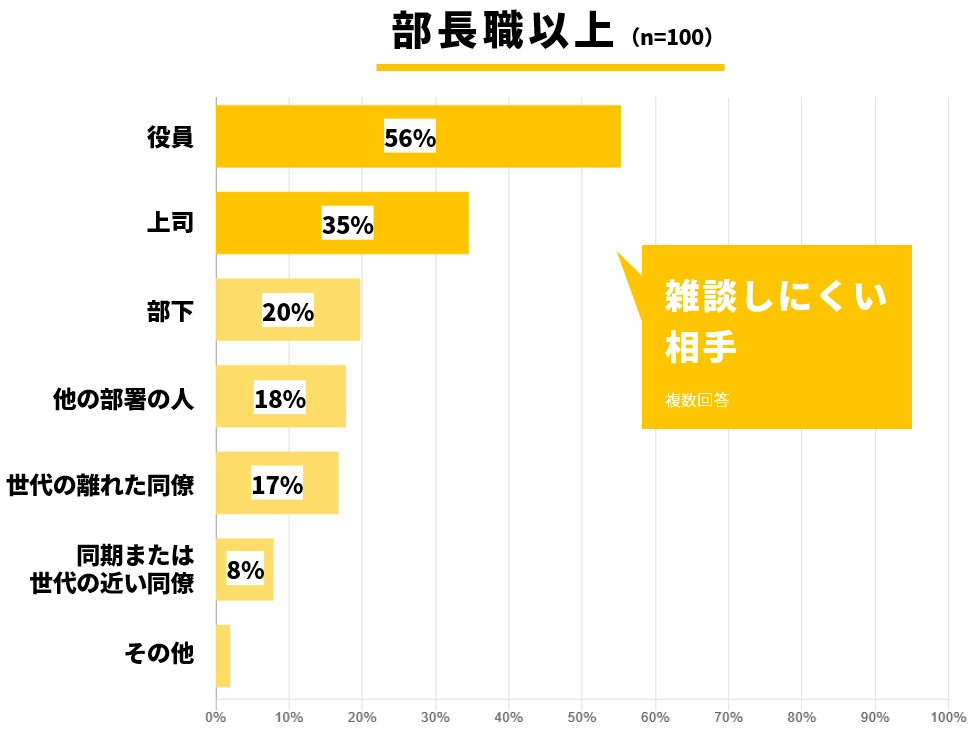 次に、雑談しにくい相手について、「一般社員」と「部長職以上」それぞれに質問しました。選択肢は前問同様で複数回答(3つまで)。結果は、「役員」については一般社員・部長職以上ともに5割以上が雑談しにくいと回答。次いで「上司」が一般社員で45%、部長職以上で35%という、他の項目と比較して高い結果となりました。