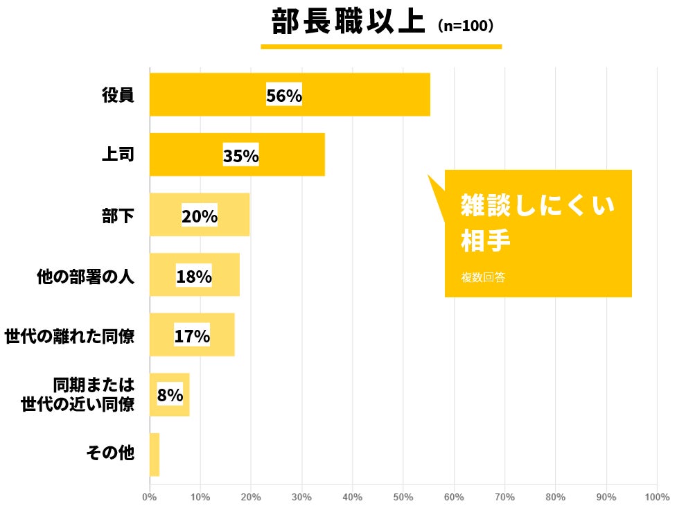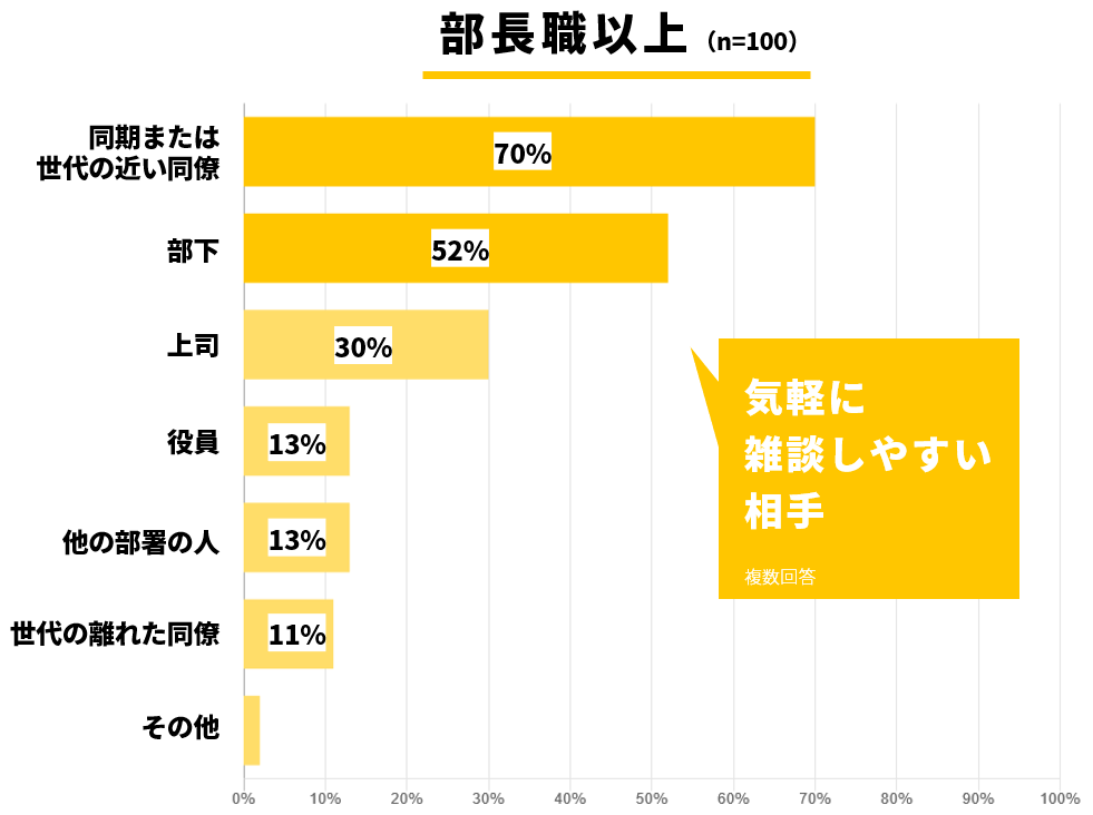 部長職以上の52%は部下と雑談しやすく、一般社員の45%は上司と雑談しにくい