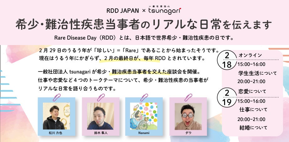 脳卒中当事者であり、左半身麻痺の症状を持つ松川力也が運営する、障がい当事者の人生の選択を手助けするための一般社団法人tsunagari(ツナガリ)は、Rare Disease Day(レアディジーズデイ、以下RDD) に合わせ希少・難治性疾患当事者の日常を伝える座談会を2月18日、19日の2日に渡って実施します。