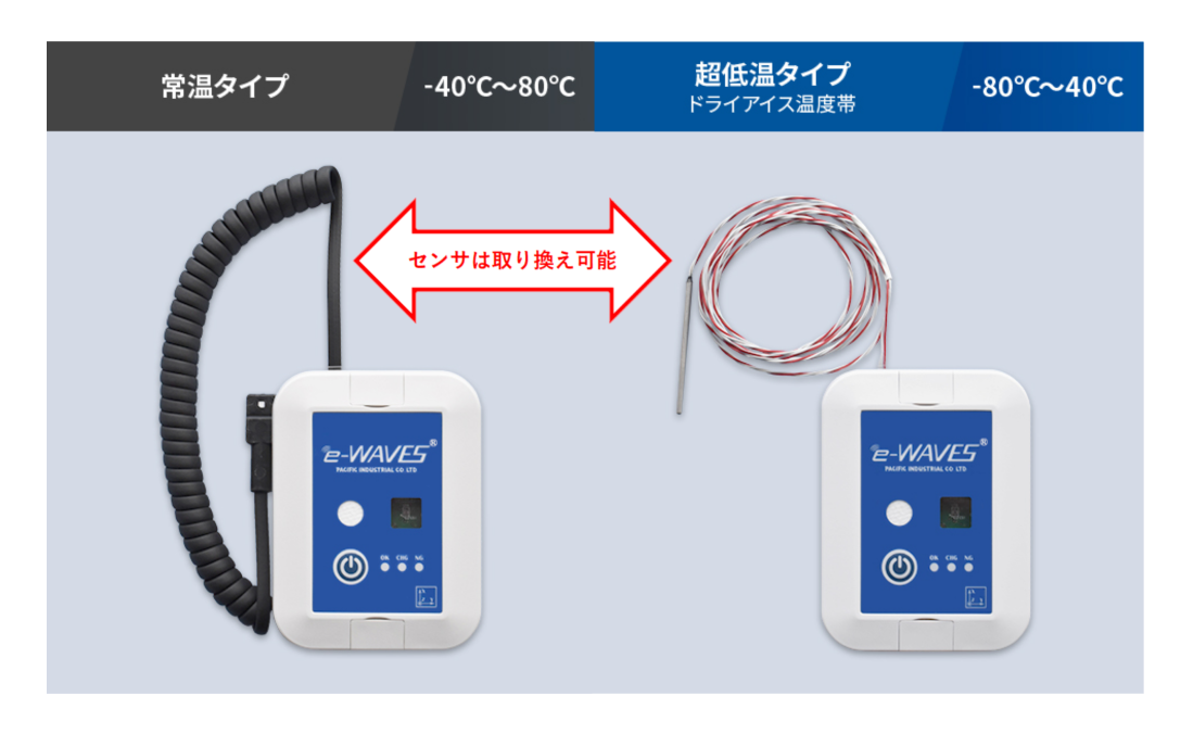 「e-WAVES」は、1台で温度、湿度、照度、加速度(振動)、位置、気圧を同時に計測し、LTE通信を用いてクラウドにデータ送信し、リアルタイムにモニタリングできる高性能マルチセンシングロガーです。外付けセンサーケーブルは、常温タイプと超低温タイプの2種類があり、-80℃から80℃まで幅広い温度域に適合しています。