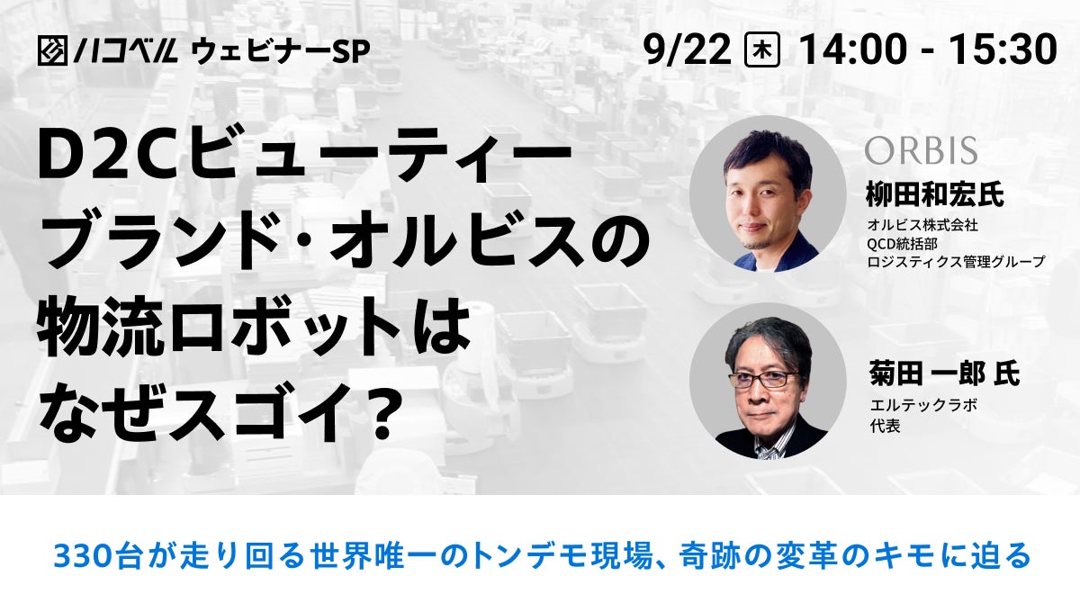 物流プラットフォーム「ハコベル」を展開するハコベル株式会社(本社:東京都品川区、代表取締役社長CEO:狭間 健志、以下:ハコベル)は9月22日(木)に、オルビス株式会社 QCD統括部 ロジスティクス管理グループ 柳田 和宏氏、 L-Tech Lab 菊田 一郎氏の両名をお迎えし「D2Cビューティーブランド・オルビスの物流ロボットはなぜスゴイ?」を開催することをお知らせいたします。