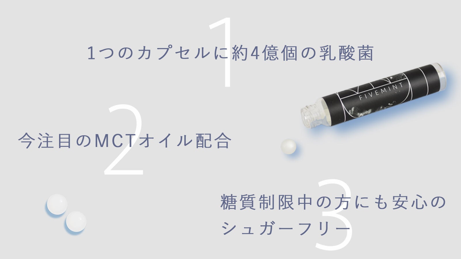 従来の水なしで噛んで使用する口臭ケア製品は、あくまでも息のニオイを緩和するための一時的なものでしたが、「FIVE MINT」は乳酸菌KT-11の配合により、口腔内環境を整えて根本に働きかける「オーラルケア」のためのブレスコスメです。継続的な使用で一時的な口臭の緩和だけでなく、お口の中を良い状態に保ちます。