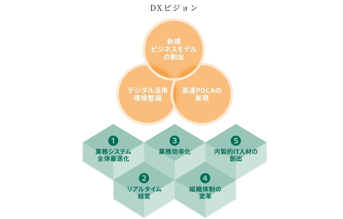 この度、デジタル技術によって人々の生活やビジネスの変容を起こすことを目的に、デジタルトランスフォーメーションに対してリアルタイム経営・業務効率化の実現を核とするDX戦略、デジタル活用環境整備・高速PDCAの実現・新規ビジネスモデルを創出の3つの柱からなるDXビジョン、5つの項目からなる推進のためのプロジェクトを策定しました。