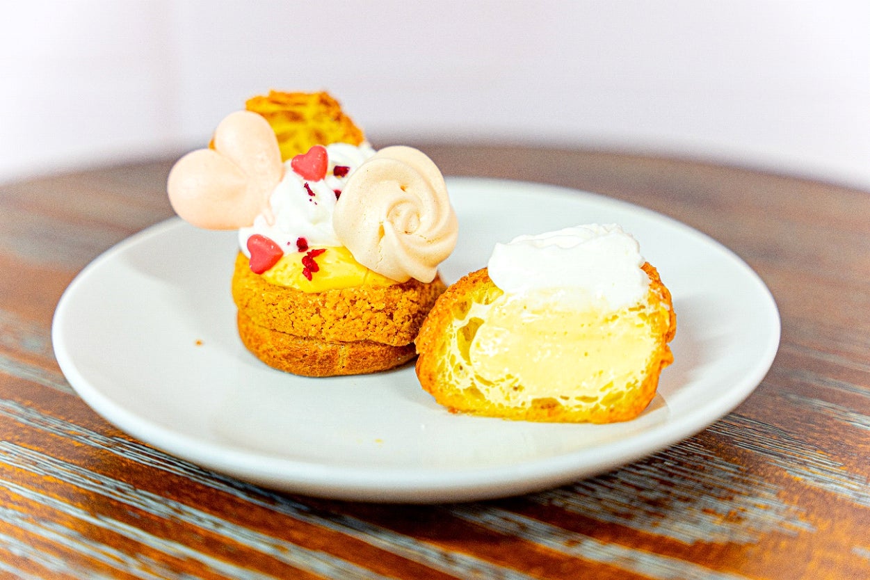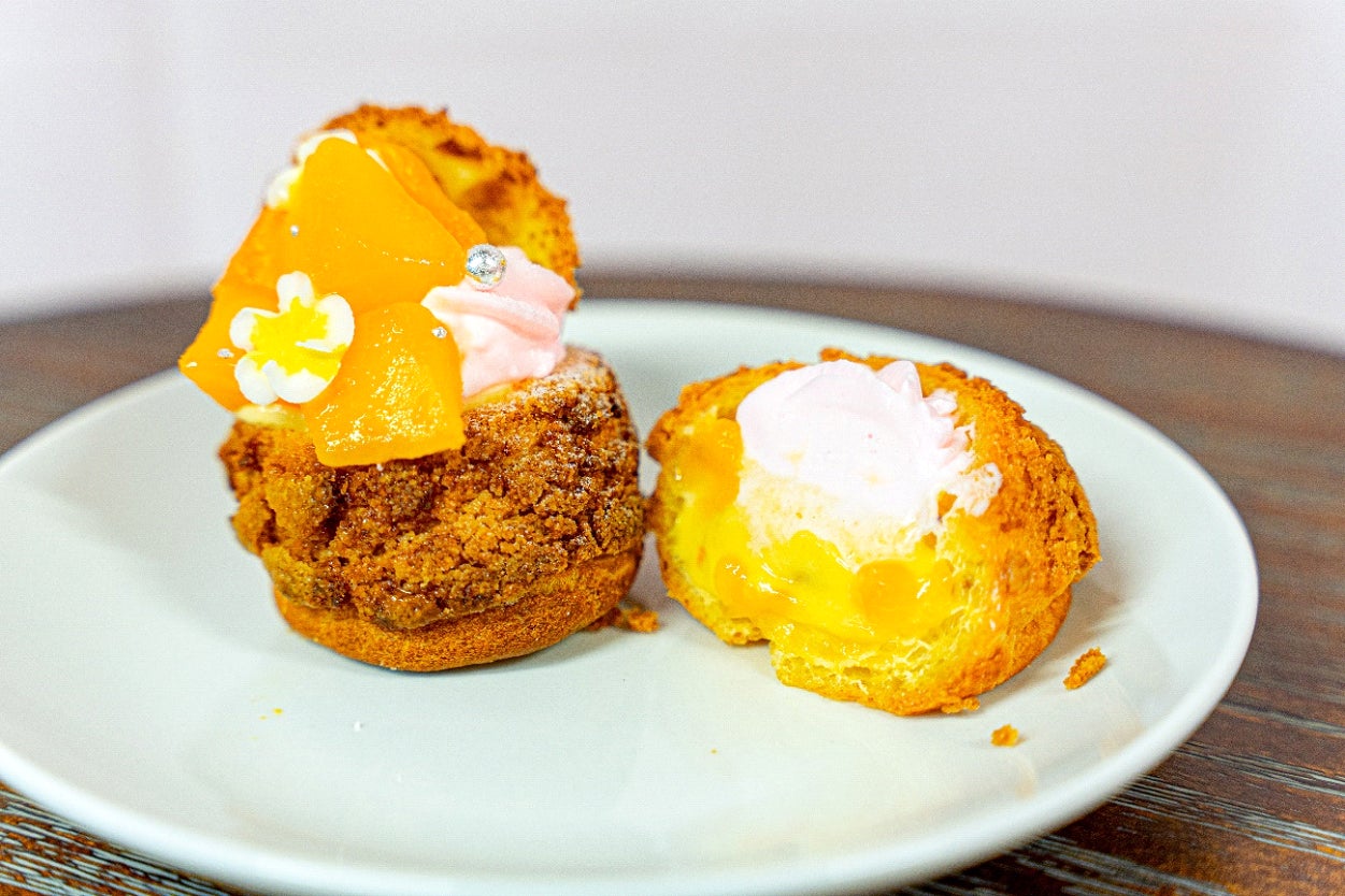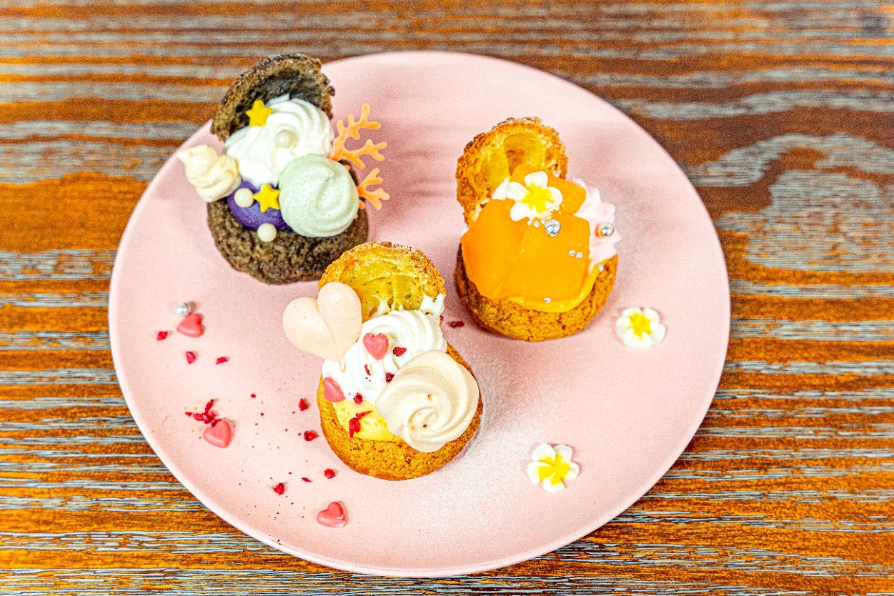 「幸せの南国シュークリーム」は、定番のカスタードシュークリームや沖縄名物紅芋、地元で取れたマンゴーなどをふんだんに使用した、贅沢&映えの新感覚シュークリーム。