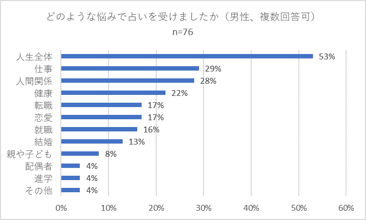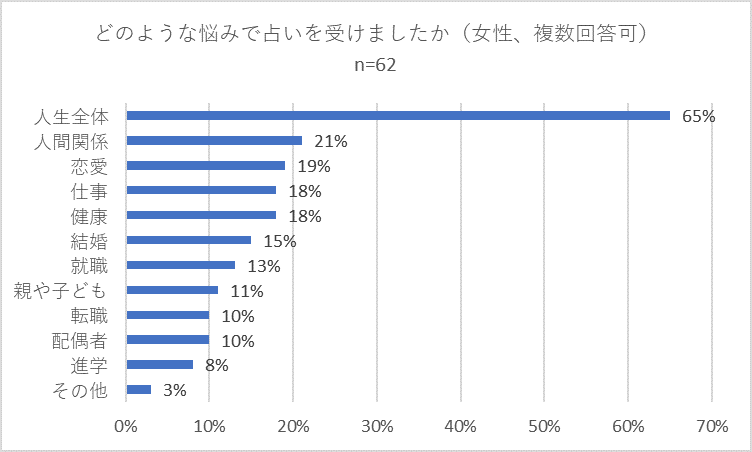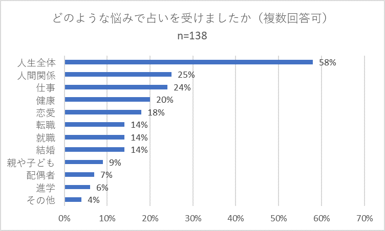 「どのような悩みで占いを受けましたか」との問いでは、全体では「人生全体」が58パーセントで圧倒的に多く、以下個別の悩みである「人間関係」(25パーセント)、「仕事」(24パーセント)、健康(20パーセント)がそれぞれ続きました。