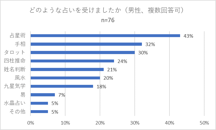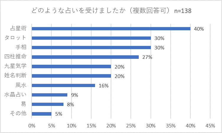次に、過去一年間に占いを受けた方に「どのような占いを受けましたか」(複数回答可)と質問したところ「占星術」が43パーセントで最も多く、「タロット」と「手相」が30パーセント、「四柱推命」が27パーセントで続きました。