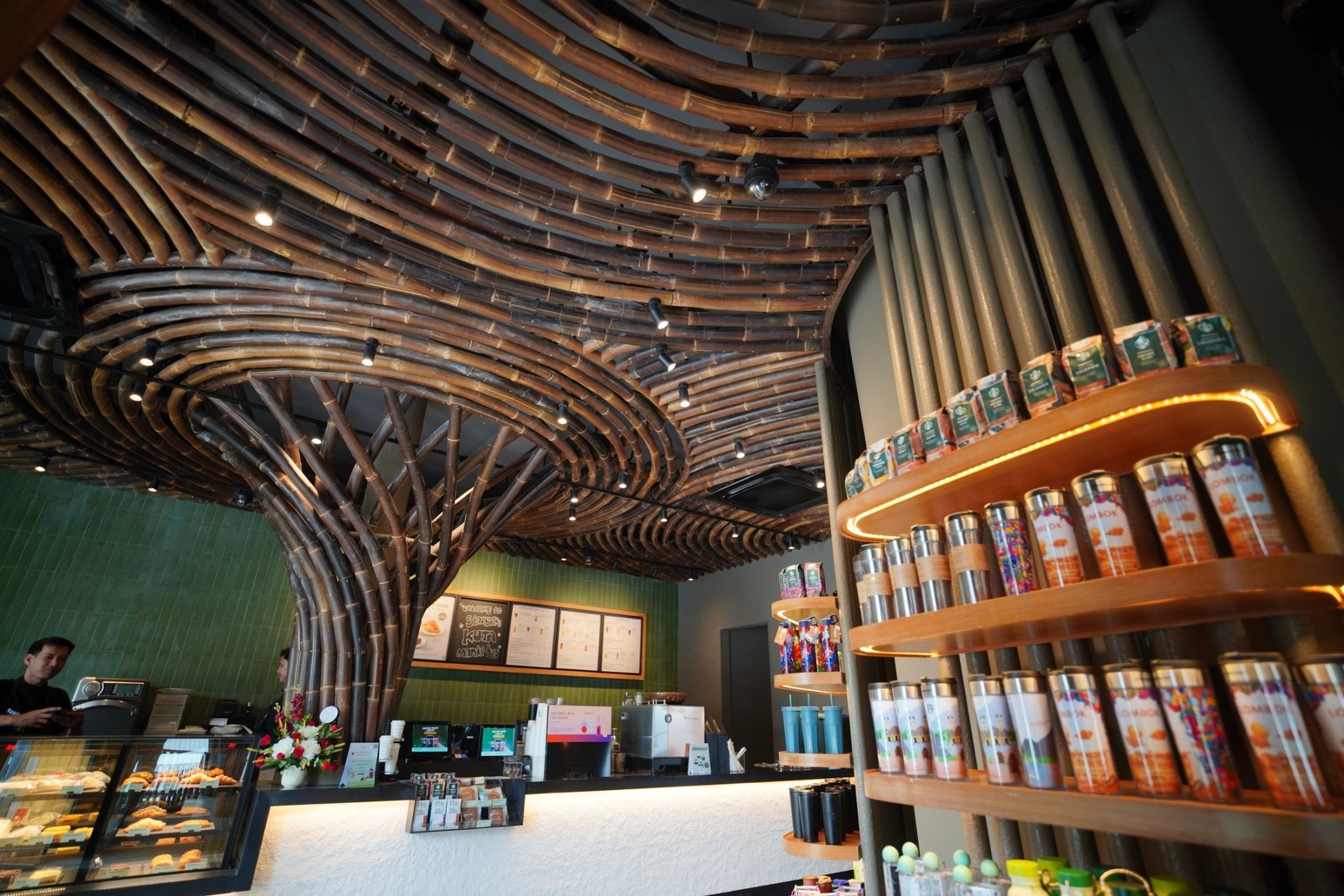 今回オープンしたスターバックス クタマンダリカは、竹のしなやかさと強度を活かしたデザインが特徴です。天井まで伸びる壮大な竹のアーチ、開放感あふれる空間、そして自然素材ならではの温もりが、訪れる人々に特別なひとときを提供します。