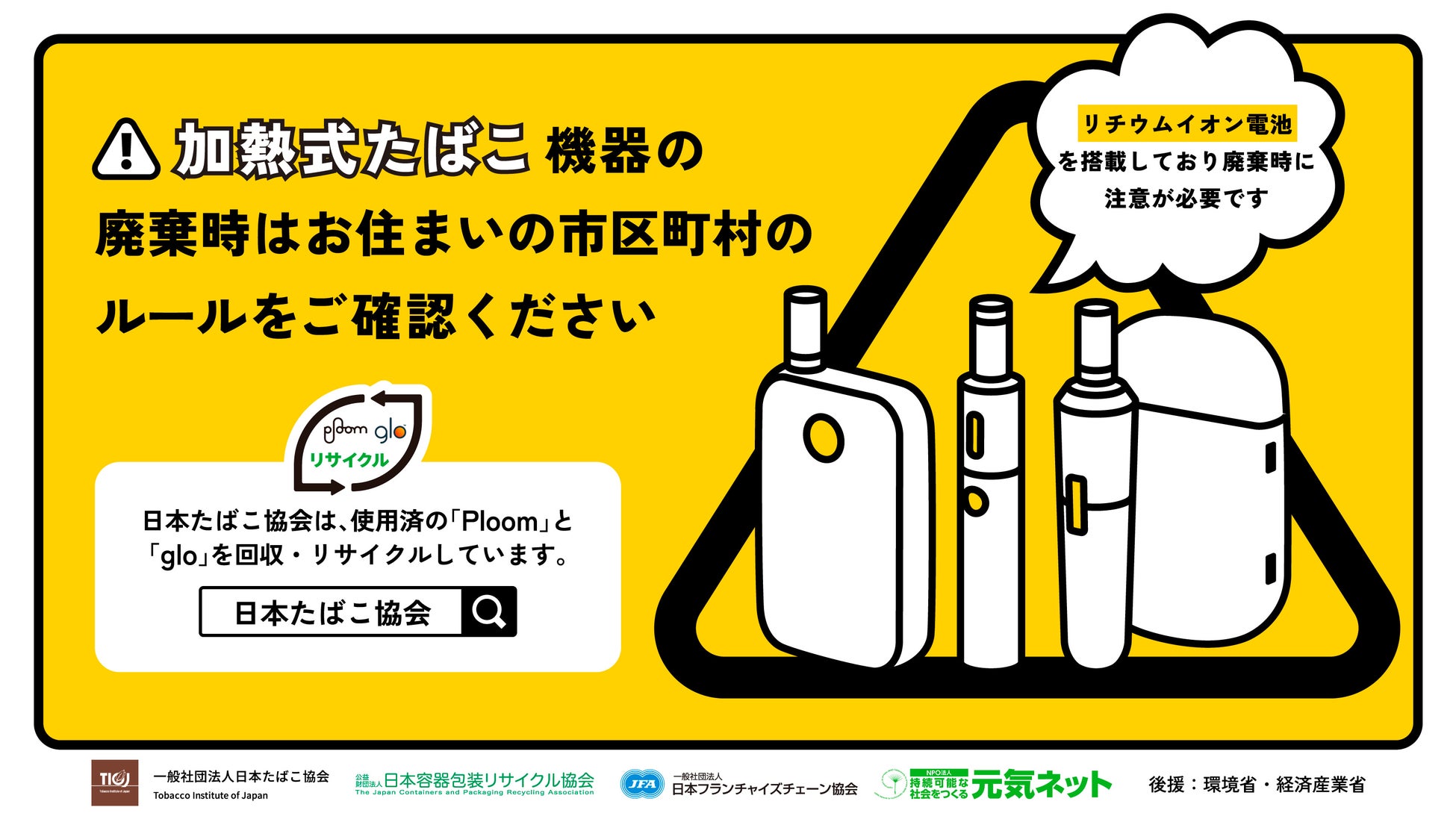 一般社団法人日本フランチャイズチェーン協会(以下JFA)、一般社団法人日本たばこ協会、NPO法人元気ネット、公益財団法人日本容器包装リサイクル協会(後援:経済産業省、環境省)は、リチウムイオン電池使用機器の廃棄方法について、JFA加盟コンビニエンスストアにてレジ画面を使用した啓発活動を実施してまいります。