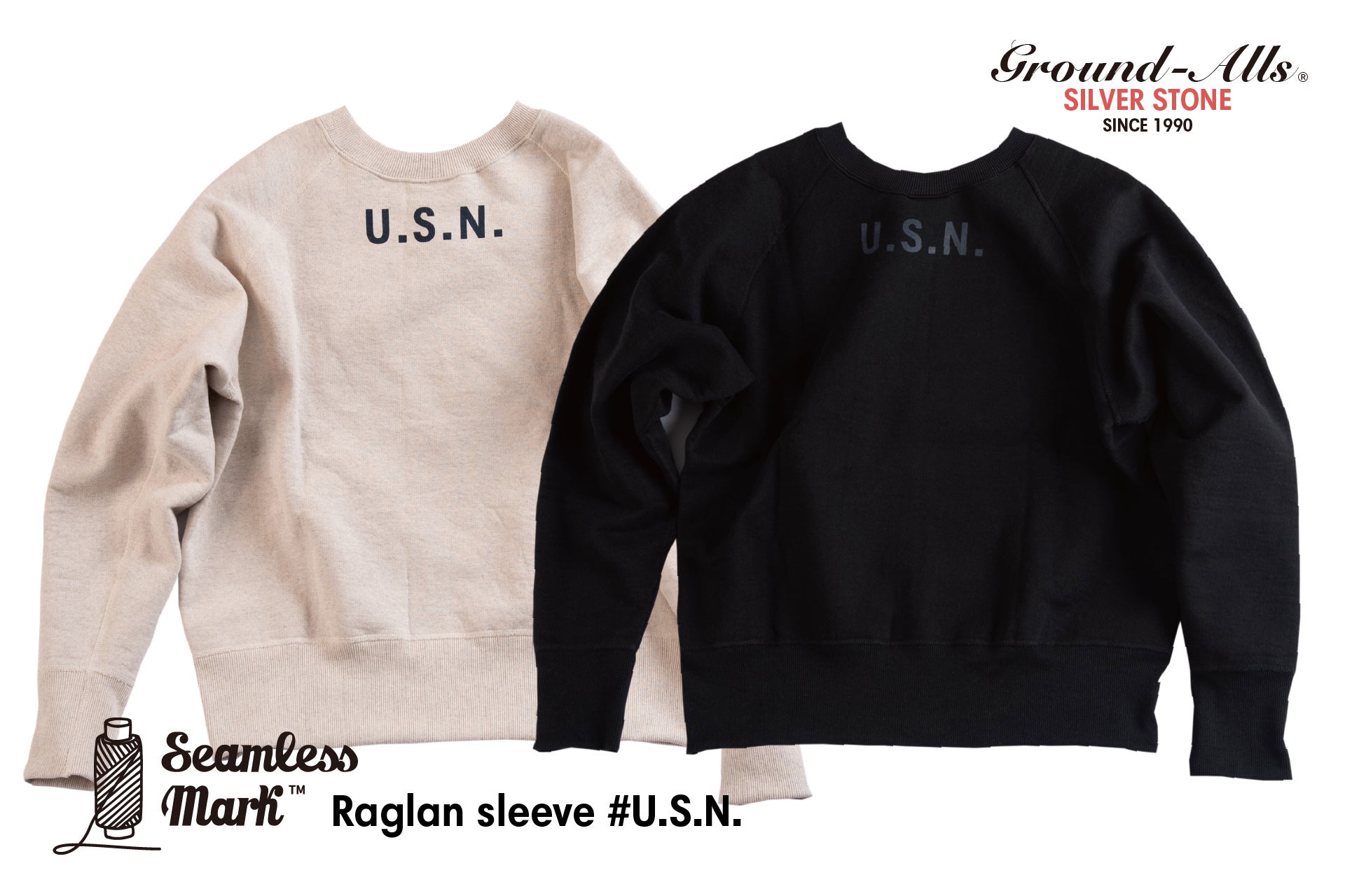 SEAMLESS(丸胴)のラグランスリーブスウェットシャツをベースに、ヴィンテージのラグランスリーブスウェットシャツにみられた、アッパーバック部分にU.S.N.(アメリカ海軍)のオフセットプリント(BLACK)、染み込みプリント(WHITE ASH)を施した。
