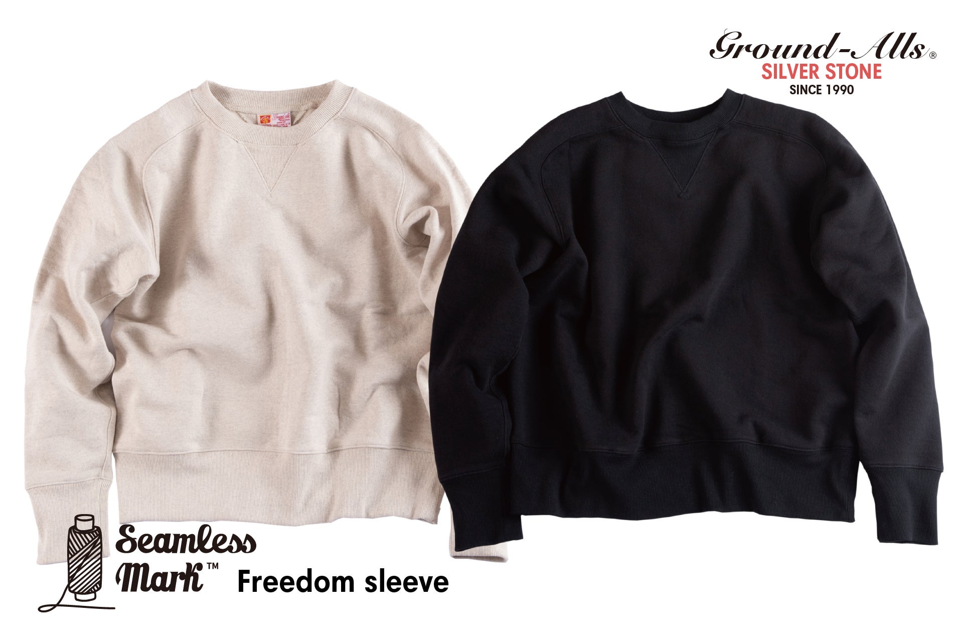 1940年代から作られ、SEAMLESS(丸胴)・裏起毛・2本針のフリーダムスリーブスウェットシャツ。肩から腕にかけて曲線に縫い、腕の可動域を広げることでフリーにし、汗止めや生地の縮み防止の両Vはめ込みガゼット仕様。
