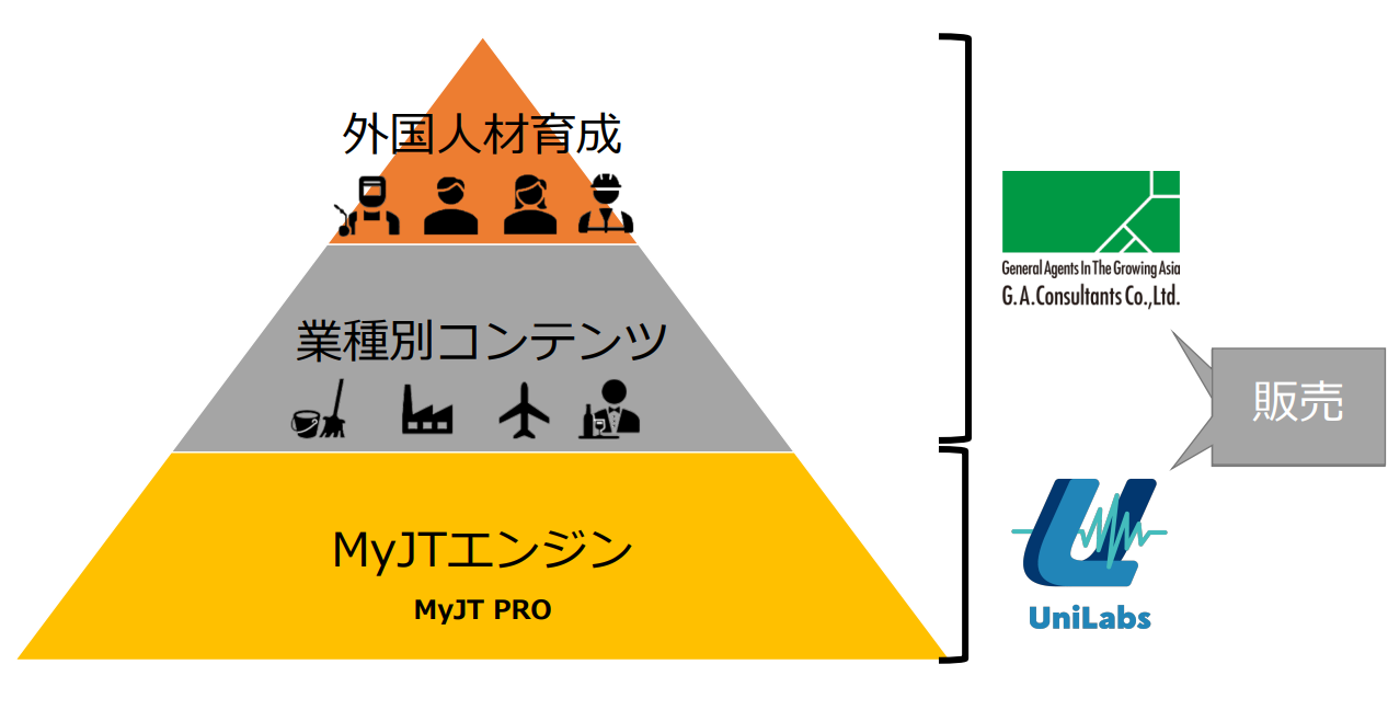そこで、今回、ジー・エー・コンサルタンツは、MyJTによる「会話」の訓練に加え各職種ごとに特化して学習するシステムのコンテンツ開発およびその販売を行うことにより、このような現状を打破するべく、UniLabsに出資も含めた業務提携を⾏い、外国⼈を採⽤する企業に広く展開することとなりました。