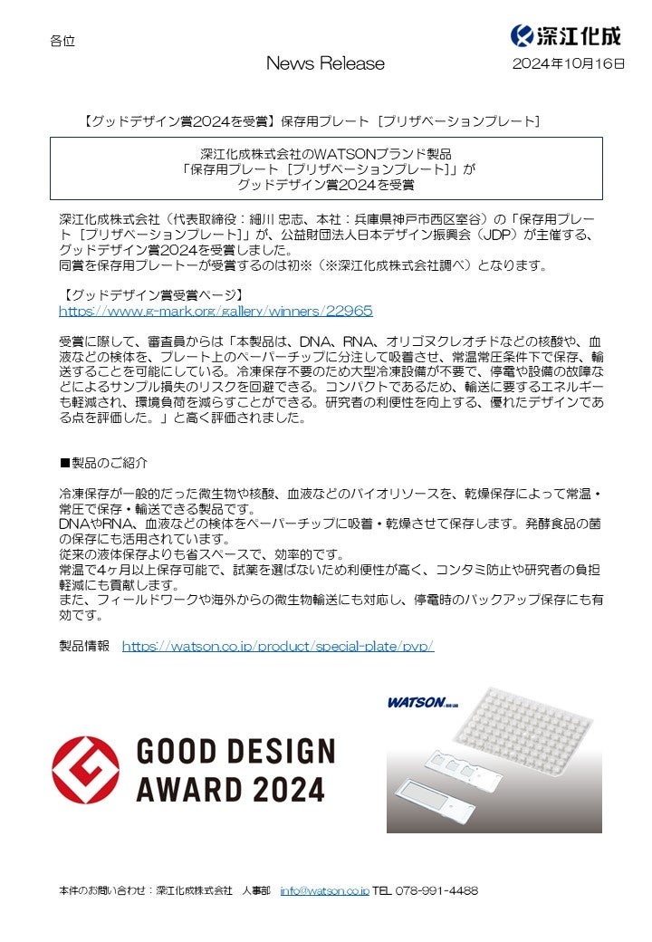 深江化成株式会社(代表取締役:細川 忠志、本社:兵庫県神戸市西区室谷)の「保存用プレート [プリザベーションプレート]」が、公益財団法人日本デザイン振興会(JDP)が主催する、グッドデザイン賞2024を受賞しました。