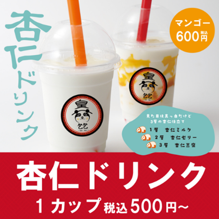 ・杏仁ドリンク(500円~/1杯)杏仁豆腐と杏仁ミルクを使用した杏仁好きにはたまらないドリンク。