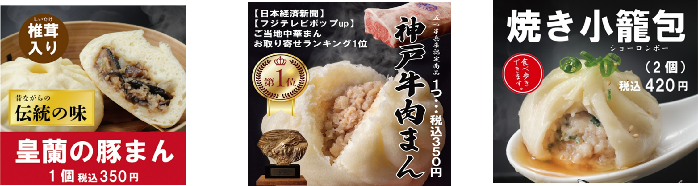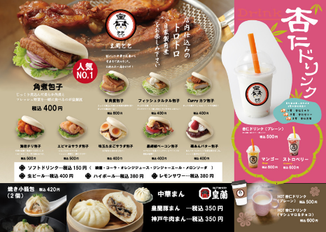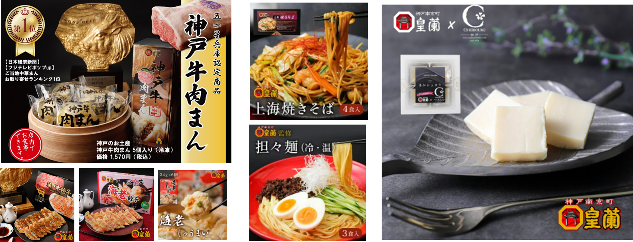 また、日経プラスワンとフジテレビ ポップUP!のお取り寄せご当地まんランキングにて双方ともに第一位を獲得した「神戸牛肉まん」を始め、「皇蘭豚まん」「焼き小籠包」「上海やきそば」「担々麺」「杏仁ショコラ」などのお土産商品も充実しています。