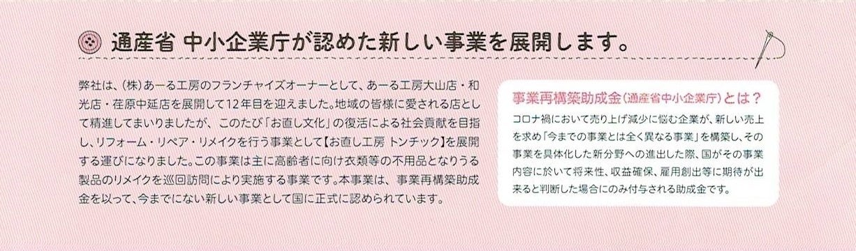 多く修理したいのに出来ないそんな方達に出来るサービスが定期的巡回訪問サービスに辿りつきました。また不要な衣類等を廃棄せず新しくリメイクする事で廃棄物軽減意識を向上してもらい地球環境に優しい社会への移行を目指す社会を取り戻したいそんな思いも込めております。
