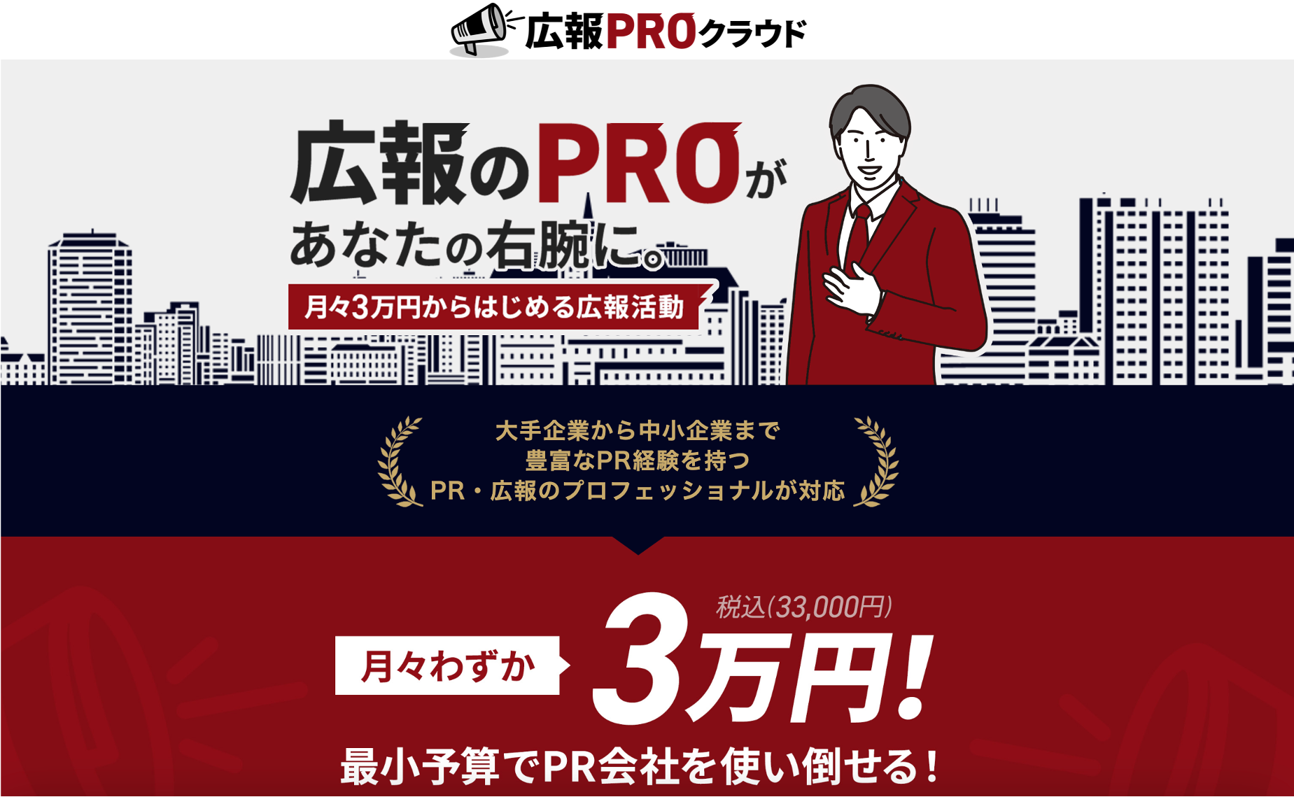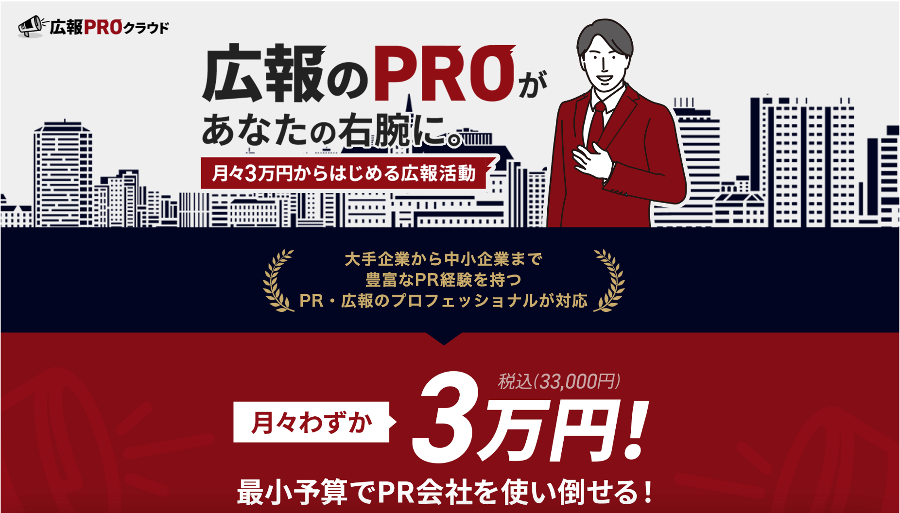 広報PROクラウドは、わずか月々3万円(税抜)から広報活動を開始できる広報のサブスクサービスです。