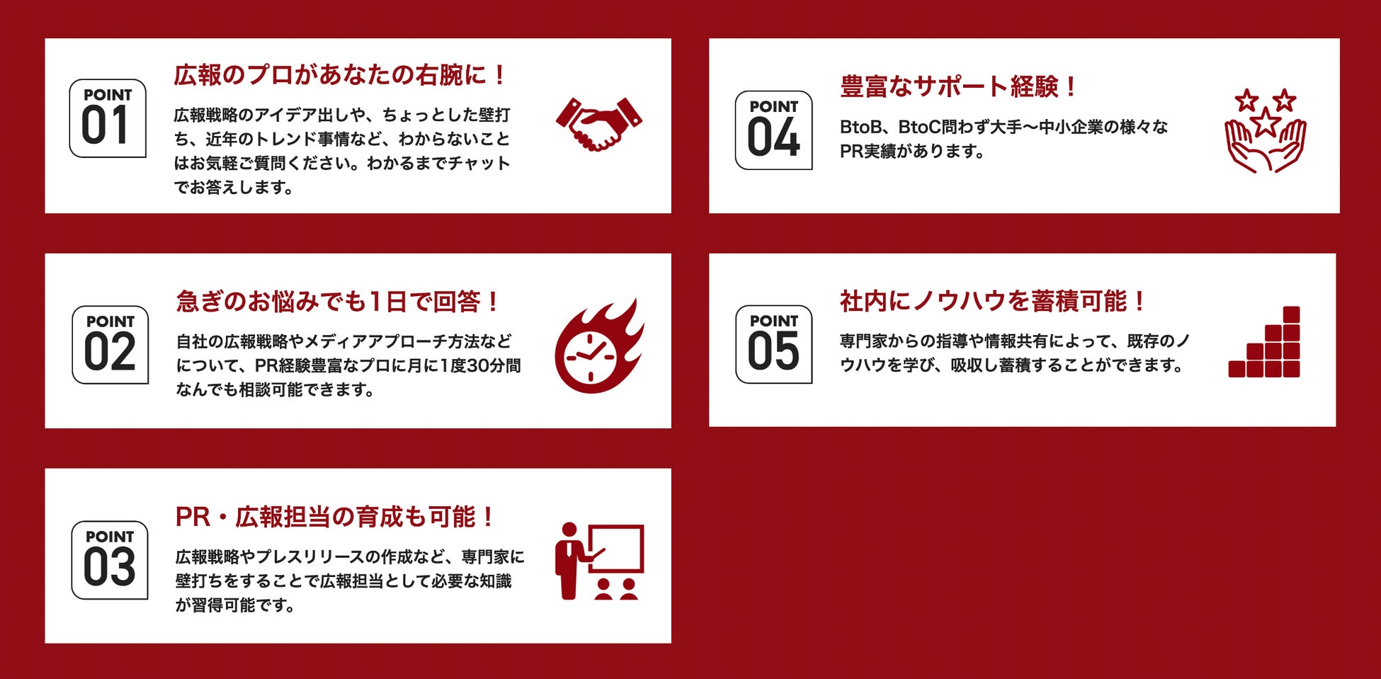 業界でも非常に低価格である月々3万円で、広報のプロがノウハウを惜しげもなく提供することで、広報活動を開始するための2つの高い壁を壊し、すべての企業が広報活動により事業成長に貢献できる世の中を目指していきます。