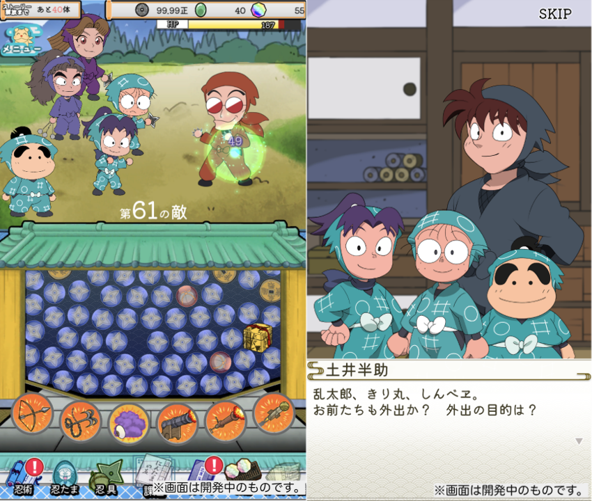 およそ30体以上登場する忍たまたちには、それぞれ攻撃力や特殊能力に違いがあり、部隊として最大7人までを組み合わせて、続々と現れる野生動物やコピー忍者たちに挑みます。