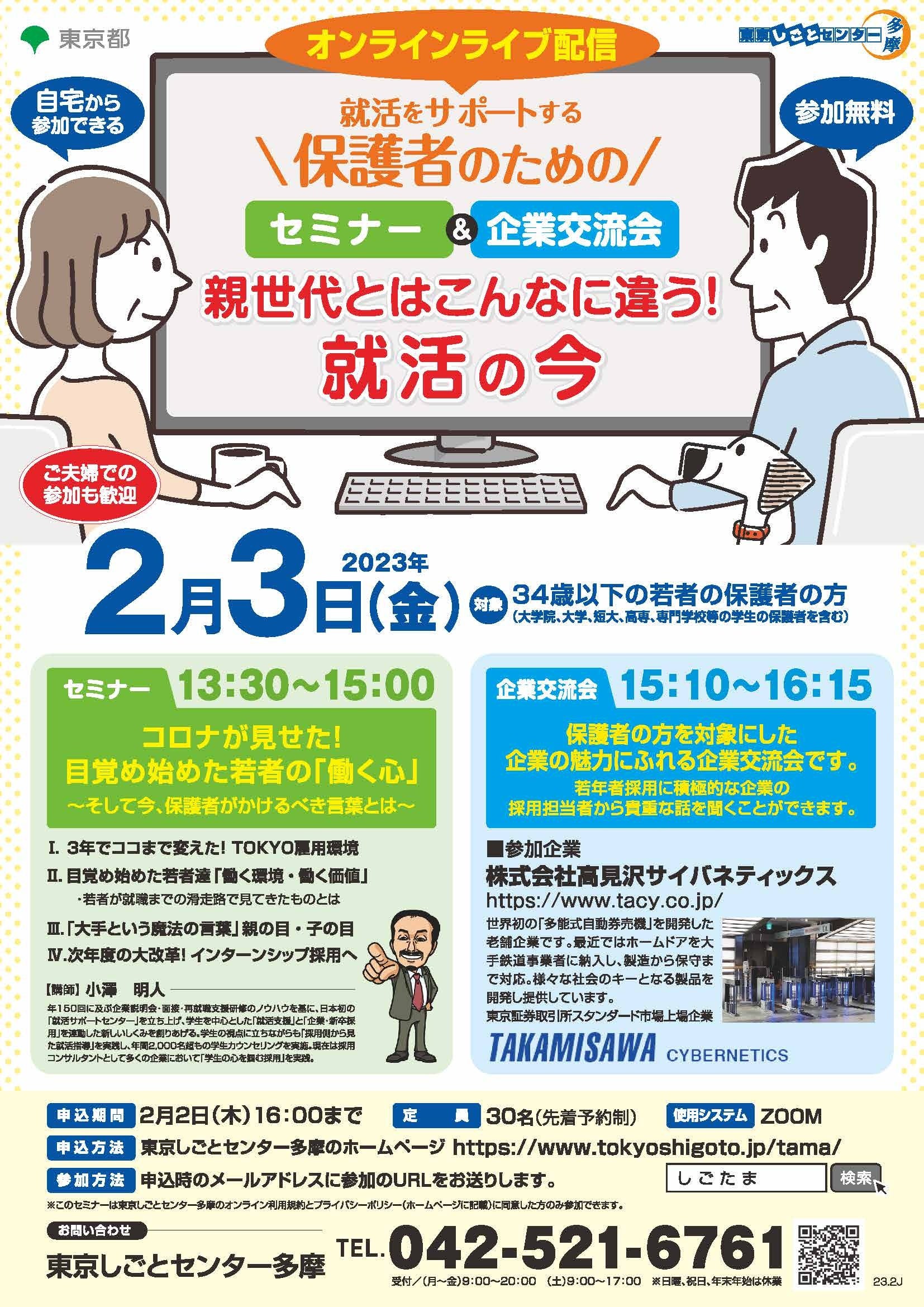 東京しごとセンター多摩では、34歳以下の若者の保護者を対象にしたオンラインセミナーをライブ配信します。参加無料でご自宅にいながら、聞くことが出来ます。