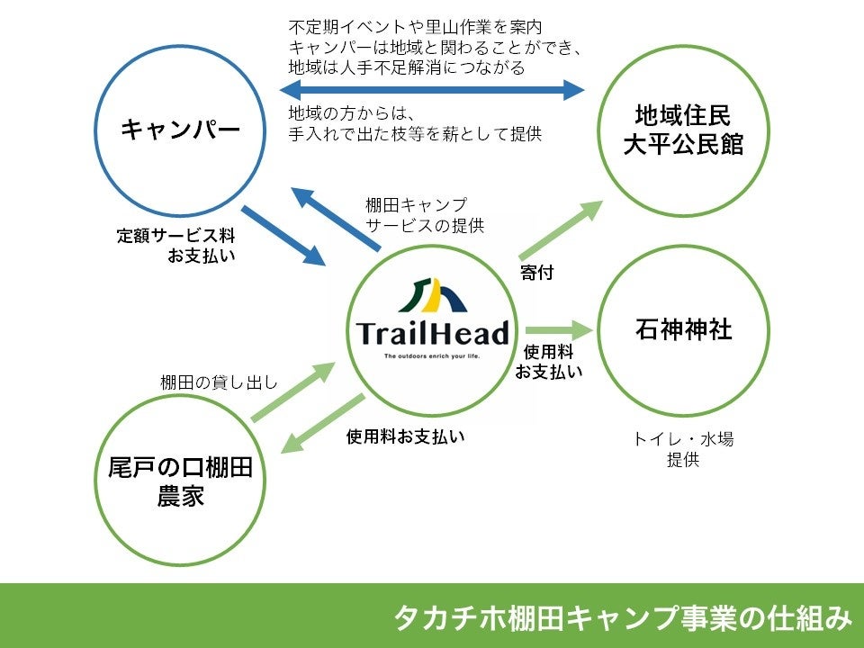 地域にとっては、棚田の風景を知ってもらえ、交流ができ、収益にもなる設計となっています。キャンパーの方々には、広大なフィールドと薪使い放題というメリットがあり、地元とのつながりも生まれていきます。