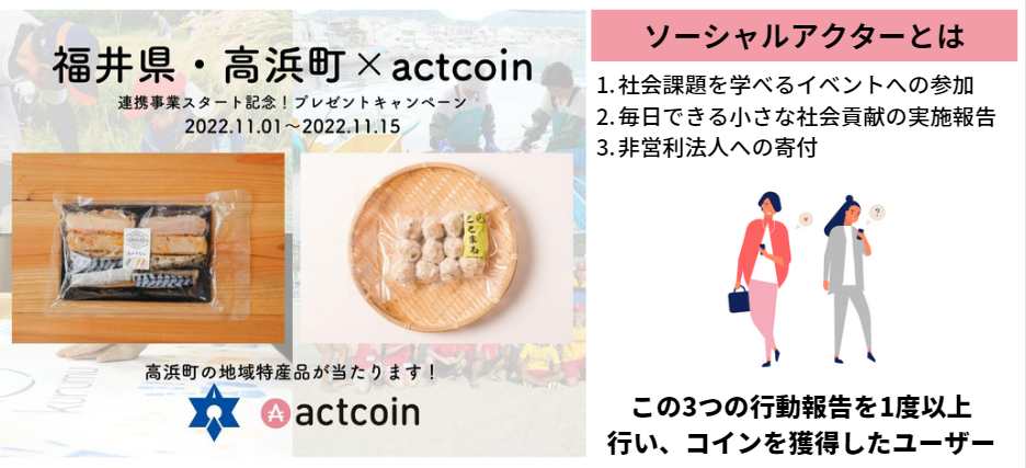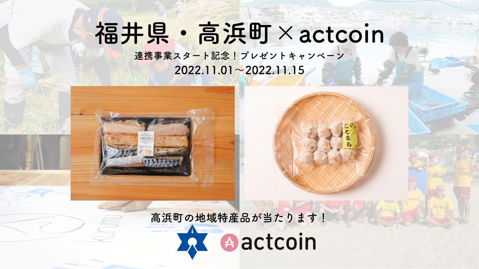 連携開始および特設ページの公開を記念して、社会貢献アプリ「actcoin(アクトコイン)」ユーザー特典キャンペーンを11月1日〜15日に実施し、高浜町の取り組みを全国に発信していきます。