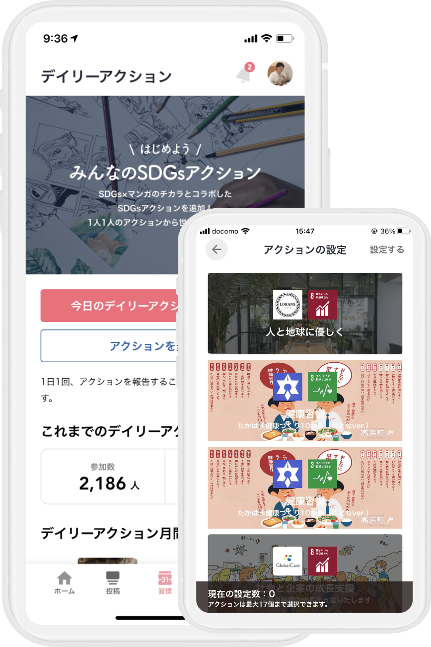 高浜町で提唱している健康づくりのアクションを、actcoinで自分がその日に何を行えたかを報告できるようシステム「デイリーアクション」を整備。見える化することで、自分の健康のためにこれまで取り組んだことが分かり、また報告をすると500コインが貯まるため、モチベーションの向上に繋げます。