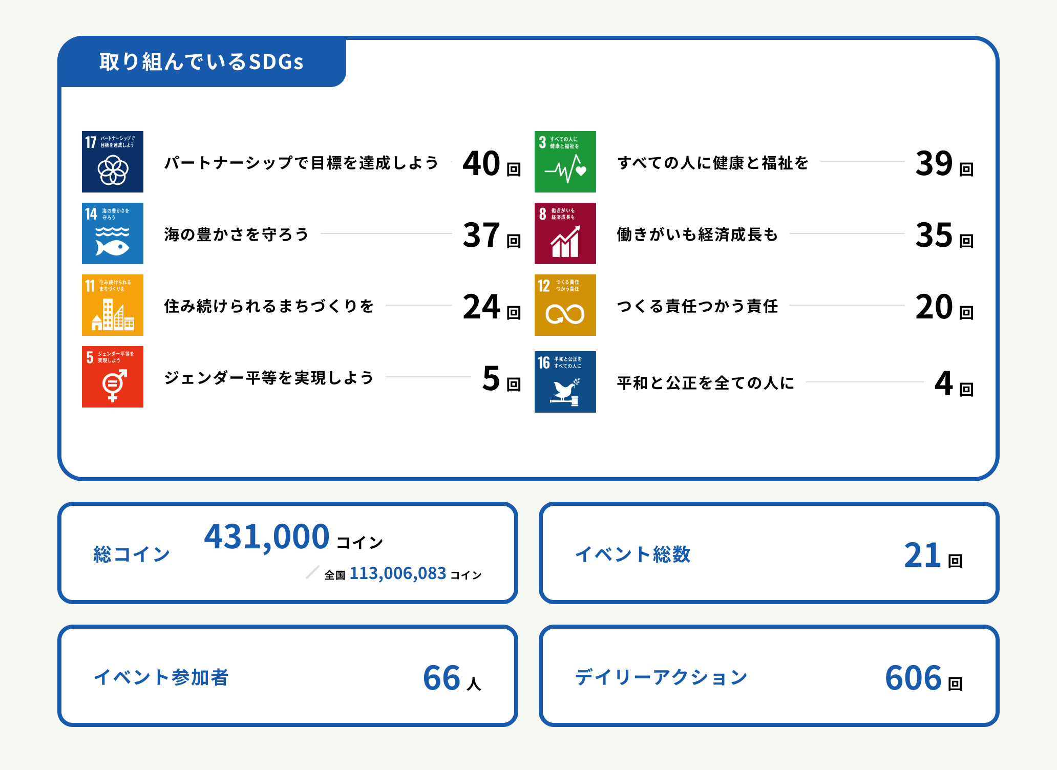 社会貢献アプリ「actcoin(アクトコイン)」と連携し、今後イベントに参加した人数や、発行されたアクトコイン数についてなどが自動で更新されていきます。