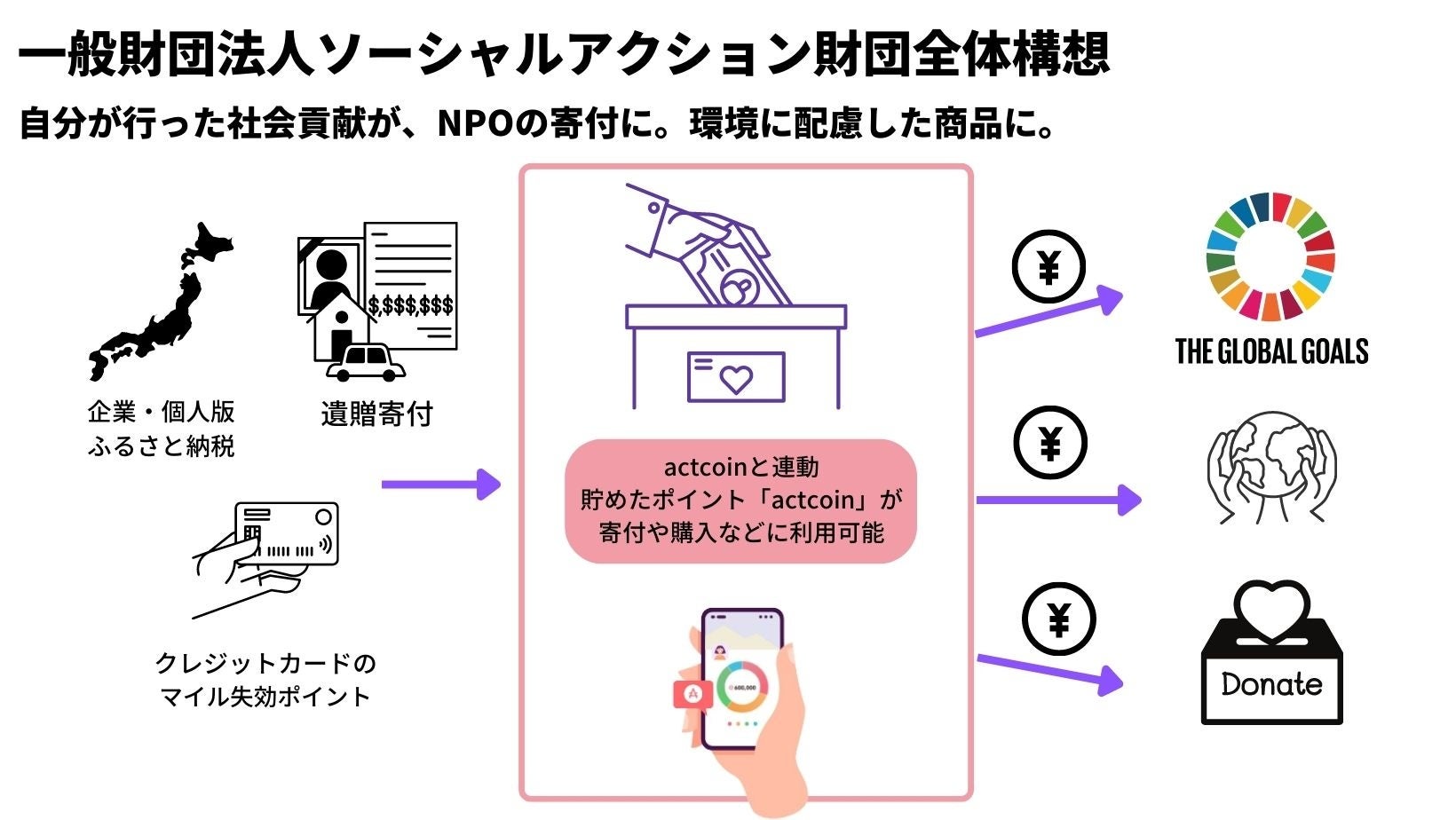 SDGs達成にアプローチする行動の実績を見える化する「actcoin」とシンクロし、寄付やふるさと納税を活用した取り組みにより資金を集め、社会課題プロジェクトを支えていきます。