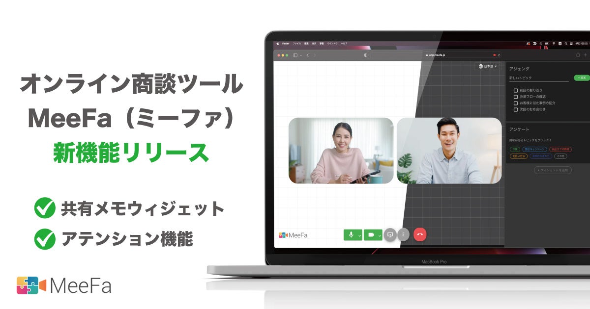 MeeFa株式会社(本社所在地 : 埼玉県北足立郡、代表取締役社長 : 石渡 裕之)は、オンライン商談ツール「MeeFa(ミーファ)」の新機能として、「共有メモウィジェット」「アテンション機能」をリリース致しました。今回リリースになったこれら2つの機能は、オンライン商談の流れをコントロールすることに役立つ機能で、特別なノウハウやコツを知らなくても効率的な商談運営ができるようになります。