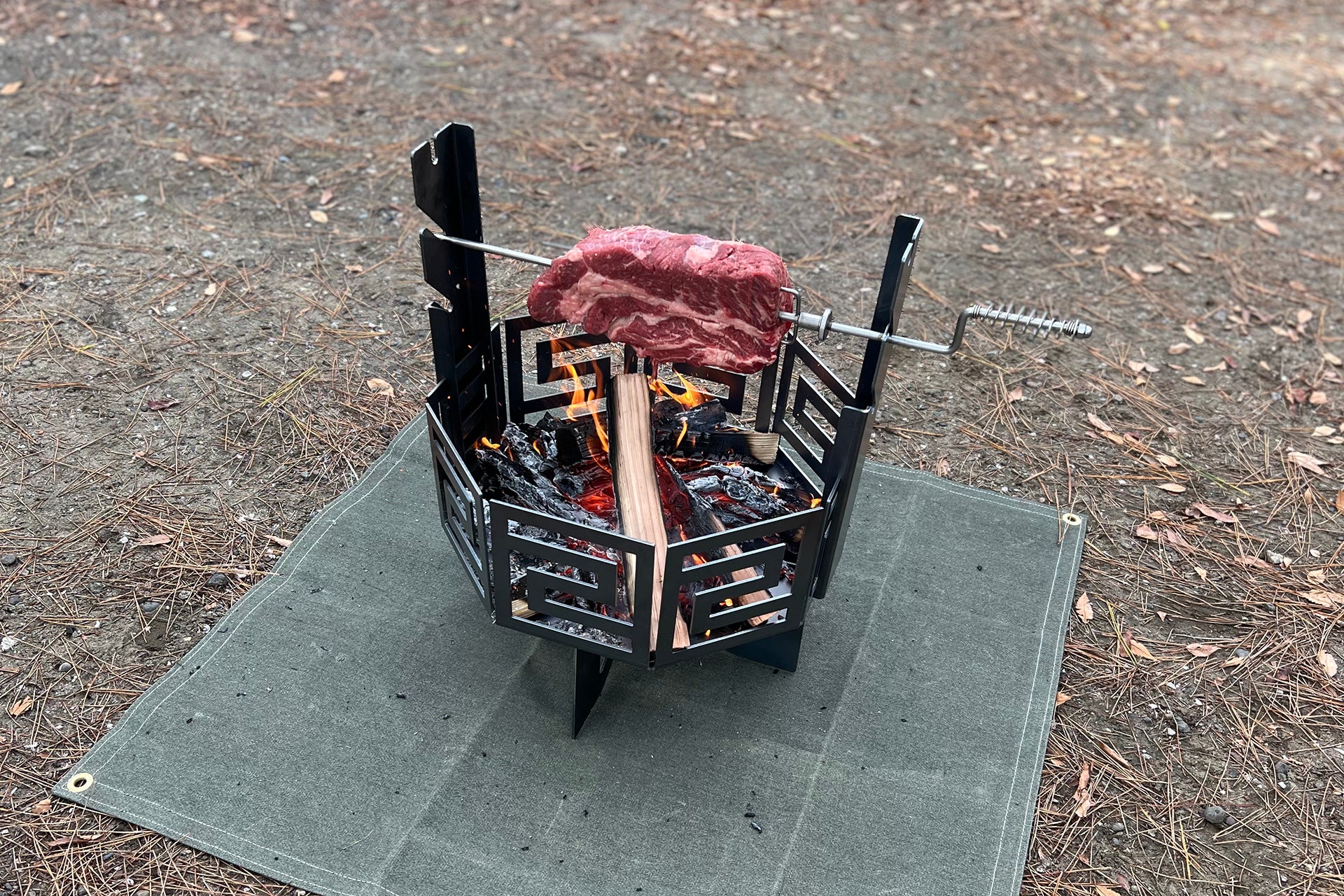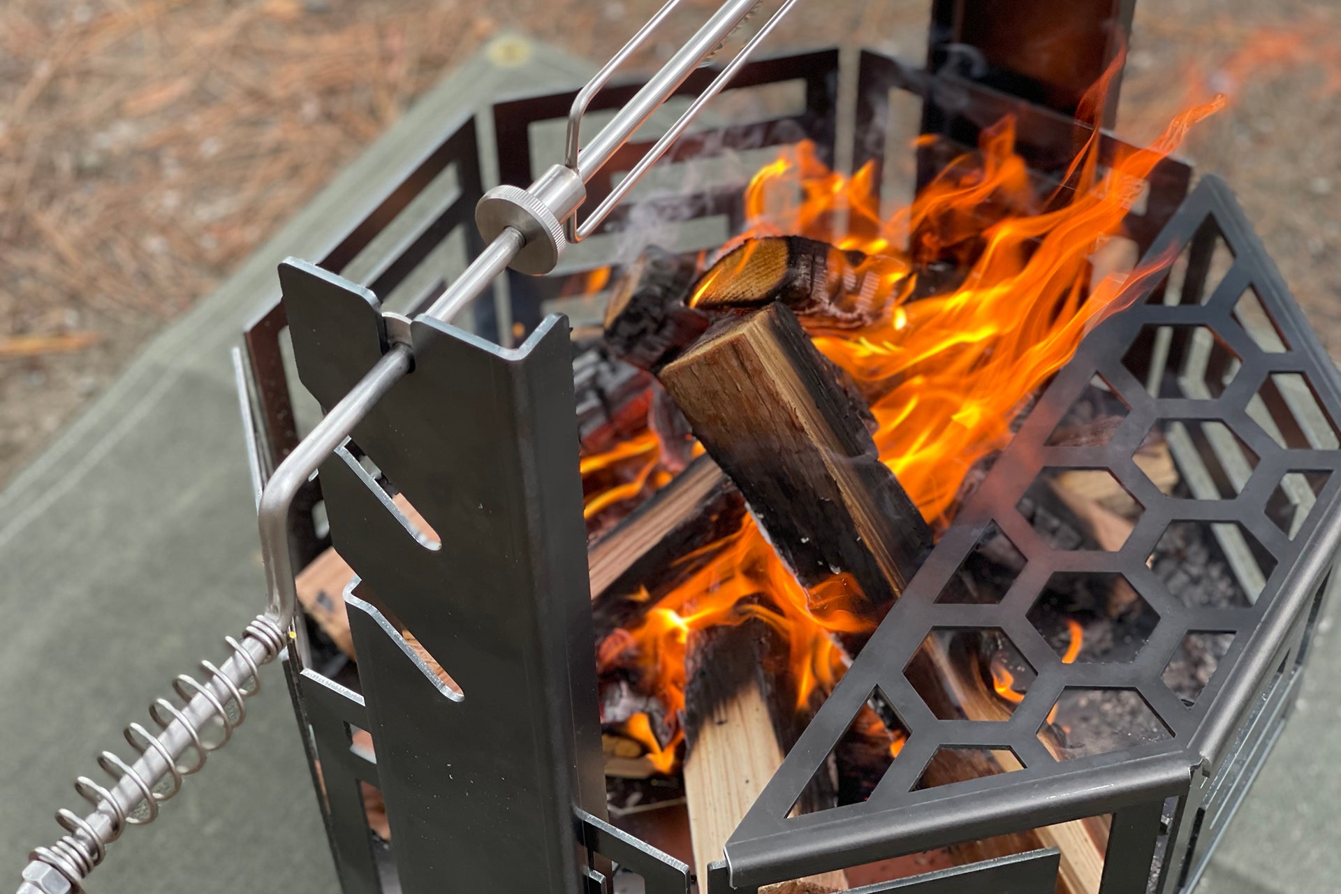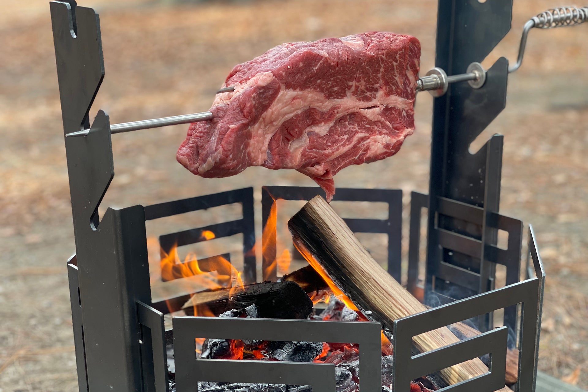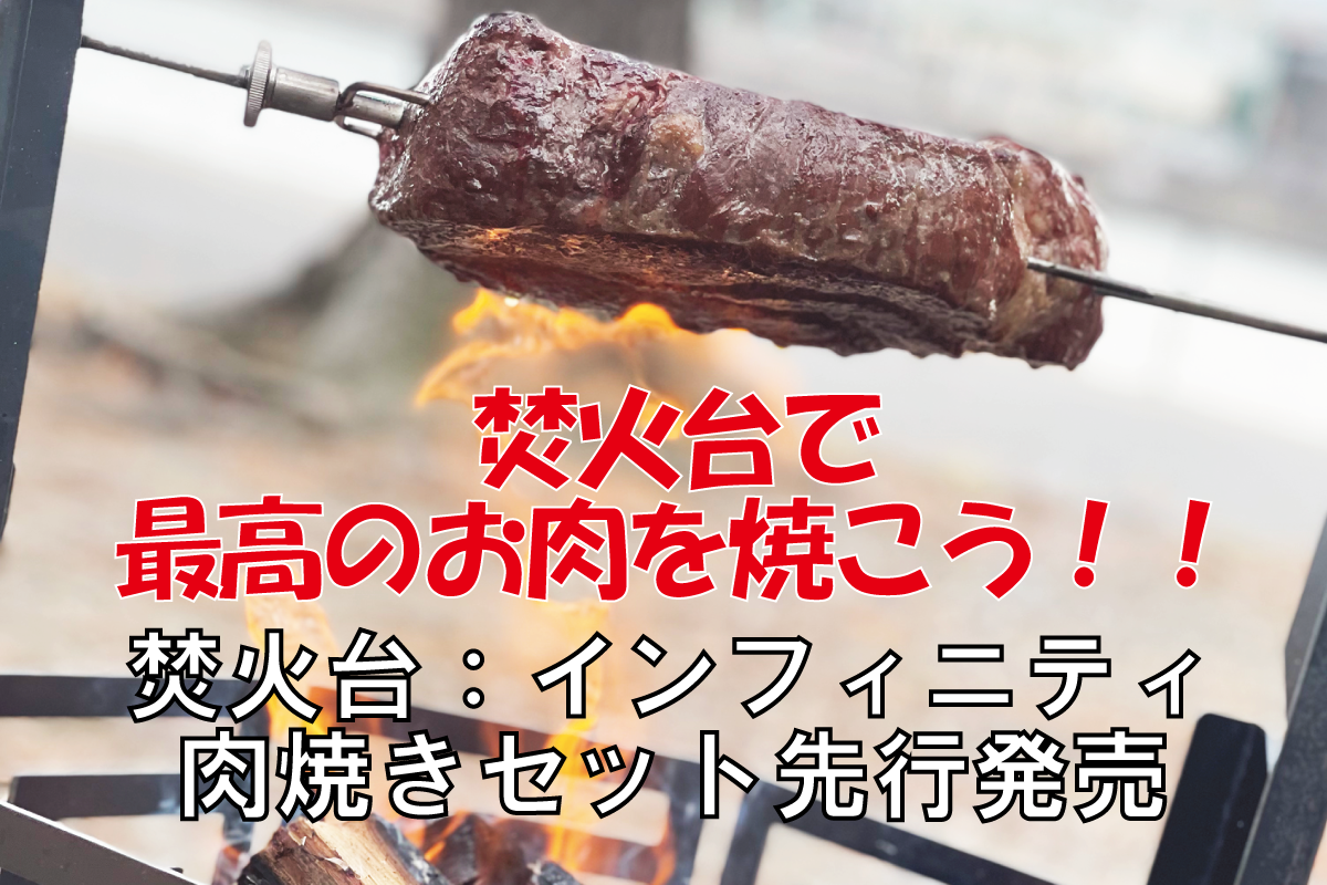 お肉をグルグル回して焼ける焚火台『インフィニティ肉焼きセット』が登場。CAMPFIREにて12月20日から先行発売開始