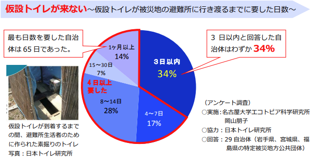 東日本大震災の教訓から、災害発生後、仮設トイレが設置されるまでには4日以上かかったところが半数以上ということがわかっています。災害が起きた瞬間は命を守ることが最優先ですが、その後の生活においてトイレ問題は重要です。