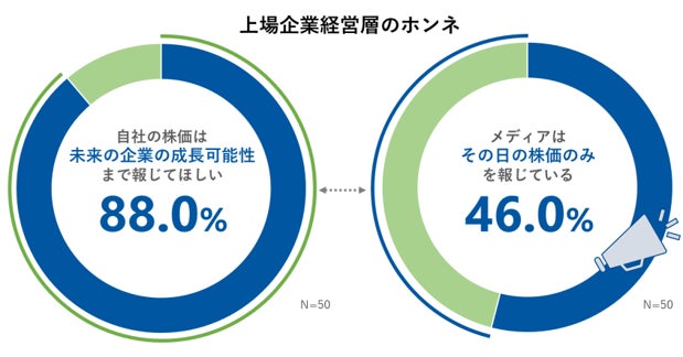 その結果、自社の株価に関する報道は、その日の株価のみではなく「未来の企業の成長可能性まで報じてほしい」と、約9割(88.0%)の人が答えています。加えて、メディアは「その日の株価のみを報じていると感じる」と回答した人が約半数(46.0%)にも及びました。