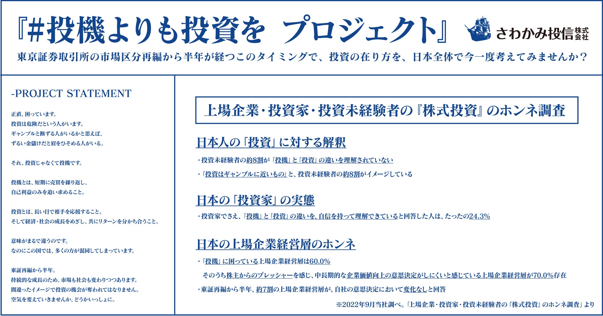 さわかみ投信株式会社(代表取締役社長:澤上龍)は、東京証券取引所の市場区分再編から半年を迎え、また「投資の日」でもある10月4日を見据え、前日の2022年10月3日より『#投機よりも投資を プロジェクト』を始動します。