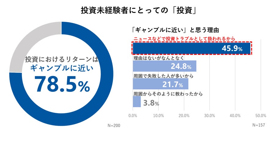 また、「ギャンブルに近い」と思ってしまう理由で最も多かったのは「ニュースなどで投資トラブルとして扱われるから」という結果に。日々の報道における「投資」のイメージが、投資未経験者に対してネガティブな印象を与えている可能性があることがわかりました。