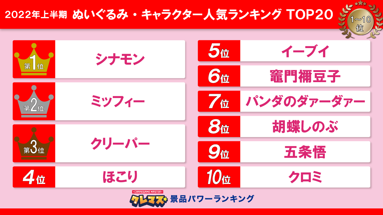 スマートフォンでいつでもどこでもクレーンゲームを楽しめる『クレーンゲームマスター-クレマス-オンラインクレーンゲーム( https://play.google.com/store/apps/details?id=jp.claw.cremas3 )』の運営をしているクレーンゲームジャパン株式会社は、同アプリにおける「2022年上半期 ぬいぐるみ・キャラクター人気ランキング TOP 20」を実施しましたので、その結果をお知らせいたします。