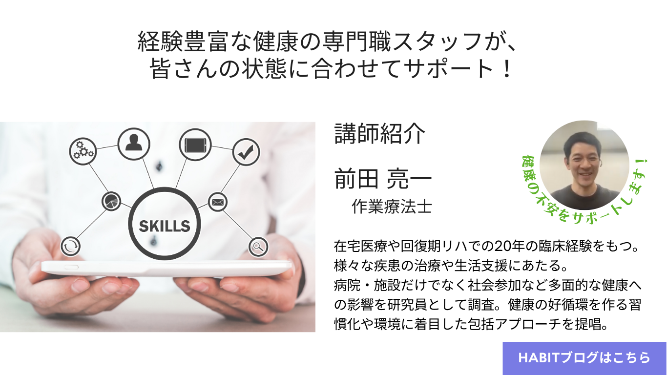 「HABIT」では、オンラインにてリハビリ専門職のコーチがアセスメントを行い、いつでも相談できます。