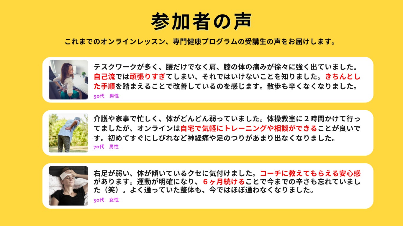 オンラインプログラム参加者より、「運動習慣づくり」と「自分に適した運動と学び」により、体調の改善、痛みの軽減した声をいただいています。
