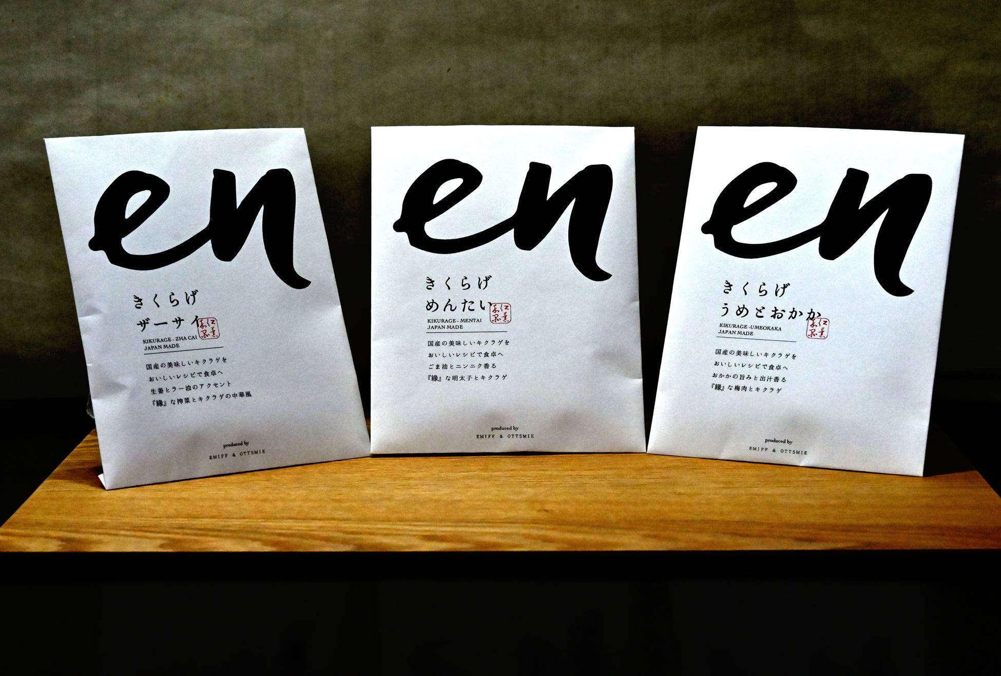 今回販売する「en」シリーズは“きくらげザーサイ”、 “きくらげめんたい”、“きくらげうめとおかか”の3種類で、ご家庭でのご利用はもちろん、3種類セットでのギフトとしてもご利用いただけます。