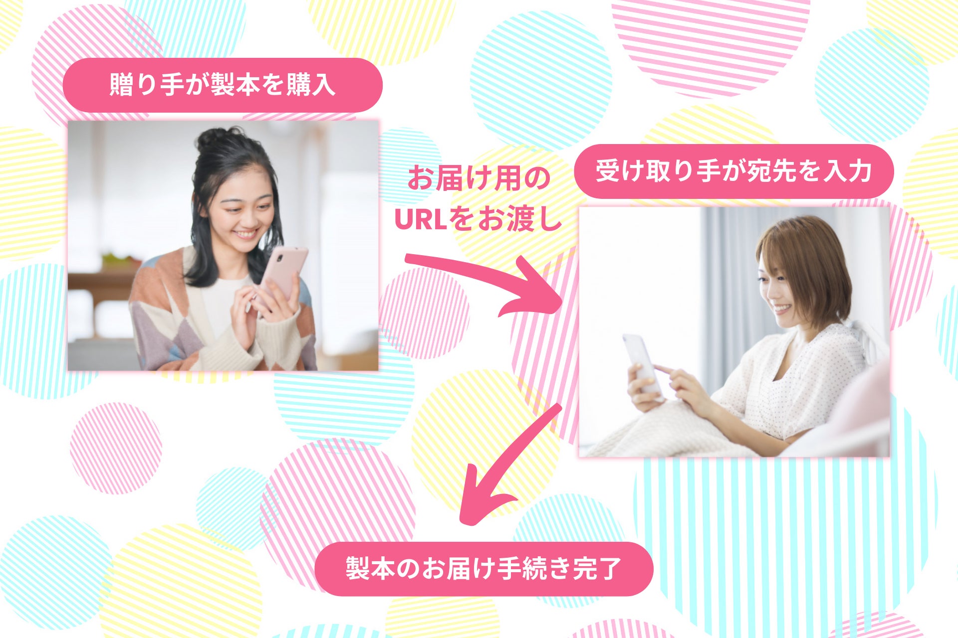 今回、追加されました「ソーシャルギフト機能」では、企画者である贈り手が、製本を購入した後に発行されるお届け用のURLを受け取り手にLINEやSNSなどでお渡しすることで、受け取り手の方はそのURL上でご自身の宛先を入力する形式となります。