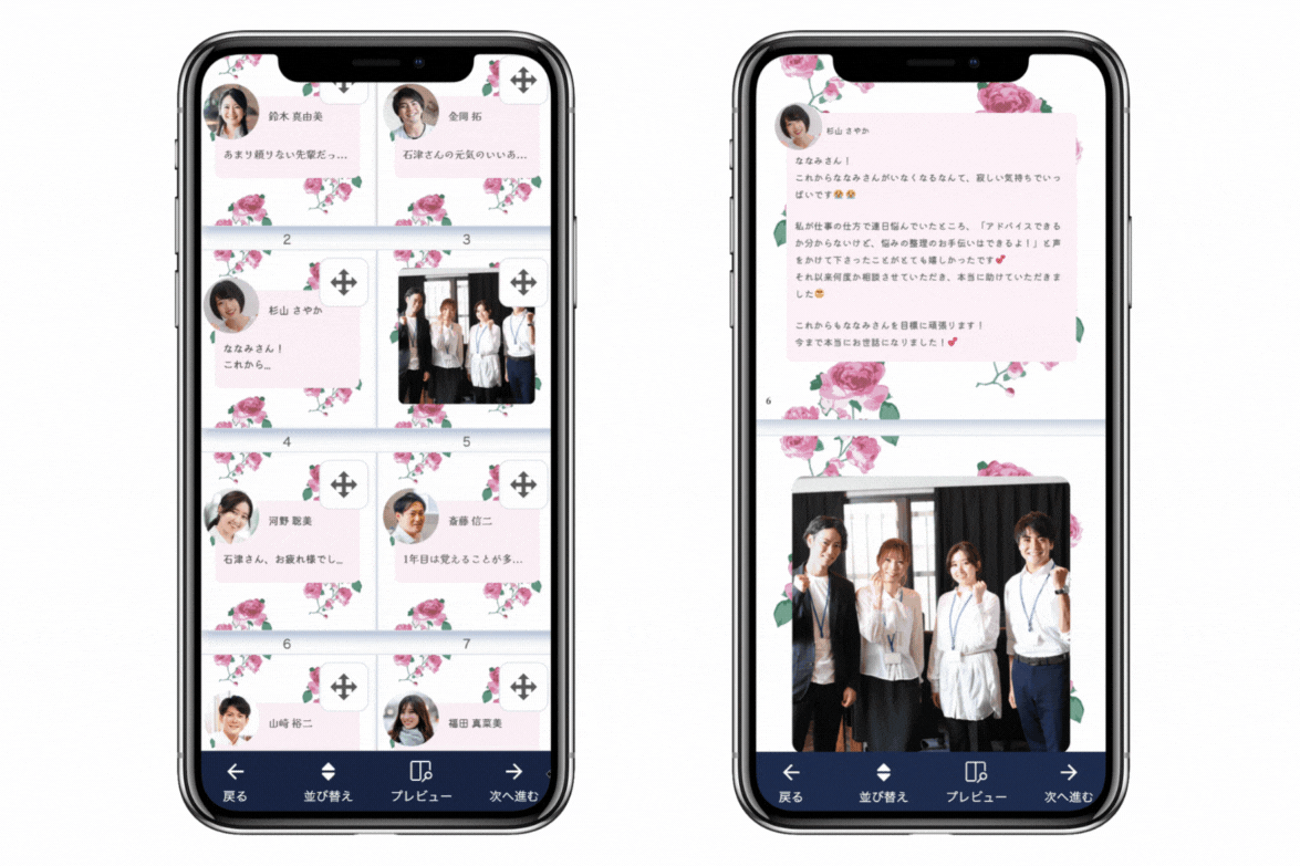 例えば製本の編集では、どのページに誰のメッセージ/写真を配置するかという並び替えを行いますが、下記の通り簡単かつ、スムーズに並び替えることが可能になりました。